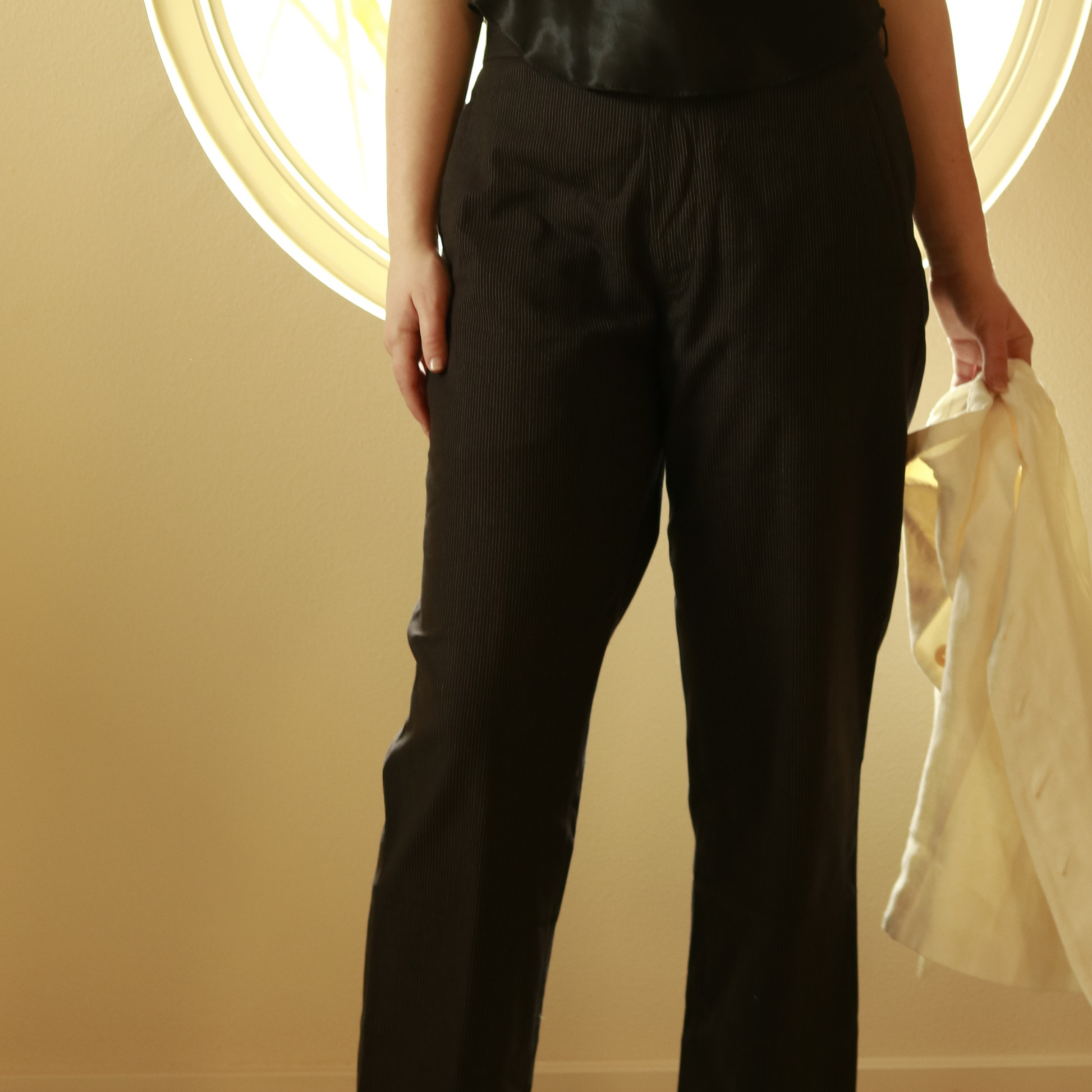 90's Vintage DKNY slacks. These pants are a light weight slack, with pin stripes. They cut off above the ankle, and rest high to mid- rise. Pair these with a cropped button up or an over sized tee.