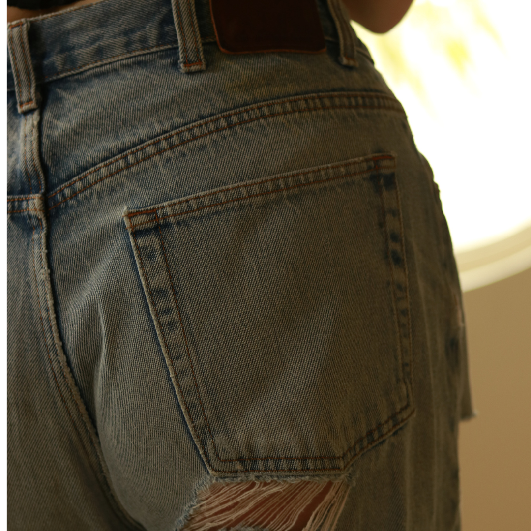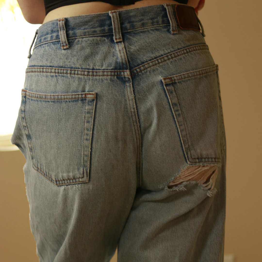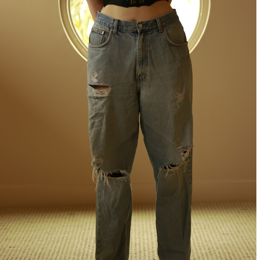 These are a loose fitted pair of vintage Calvin Klein Denim. There is distressing to the butt, knees and hip. The pants are in great condition, but there are rips for a more vintage distressed appearance. The wash on these pants is stunning, and perfect for all seasons, especially the summertime. These jeans are a 90's style denim, and look so cute paired with both fitted crop tops, or a loose fitted vintage tee. The Size fits looser than a size large, but if you like big and baggy these are perfect for someone who has a bottom that ranges between L-XL.
