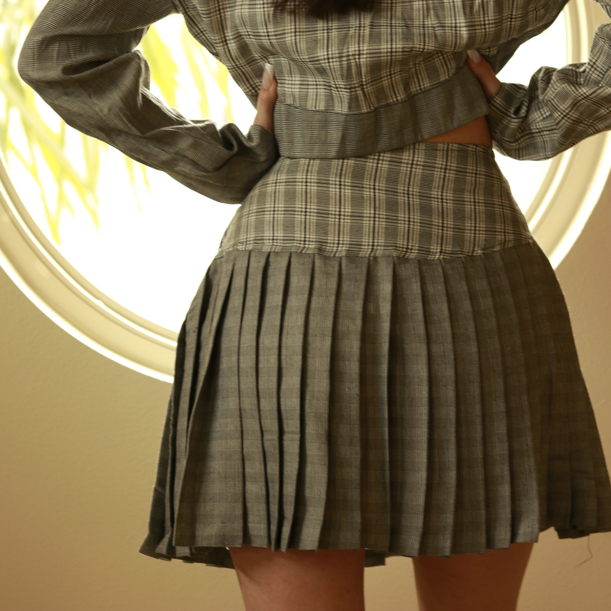 This vintage pleated skirt has a zipper on the side, a 4" long waistband, and pleating in the skirt section below. The skirt also has contrasting plaid fabrics to match the Sunday Stroll Blazer perfectly. Just like the blazer, this skirt runs rather small and would fit an XS best.