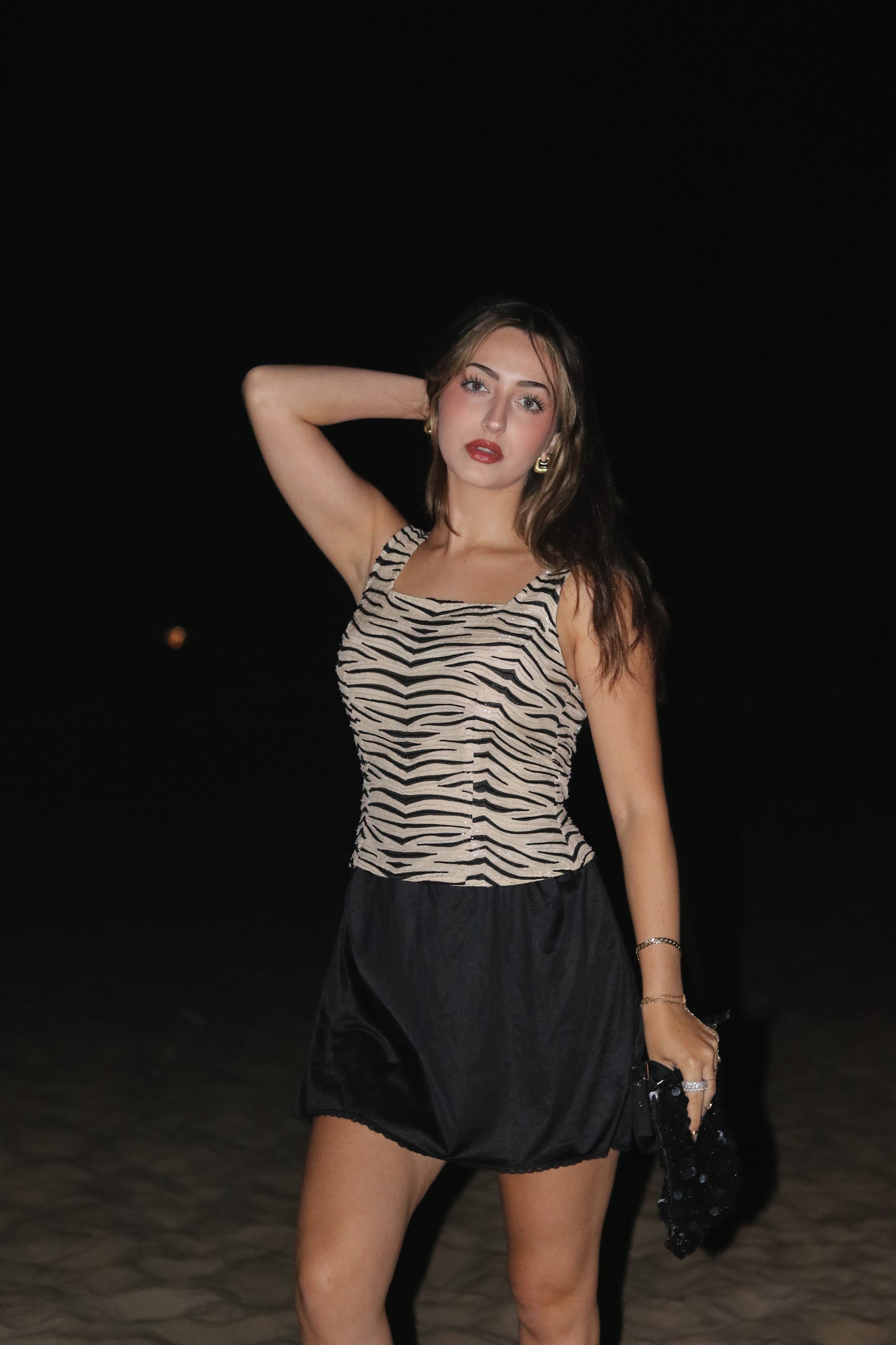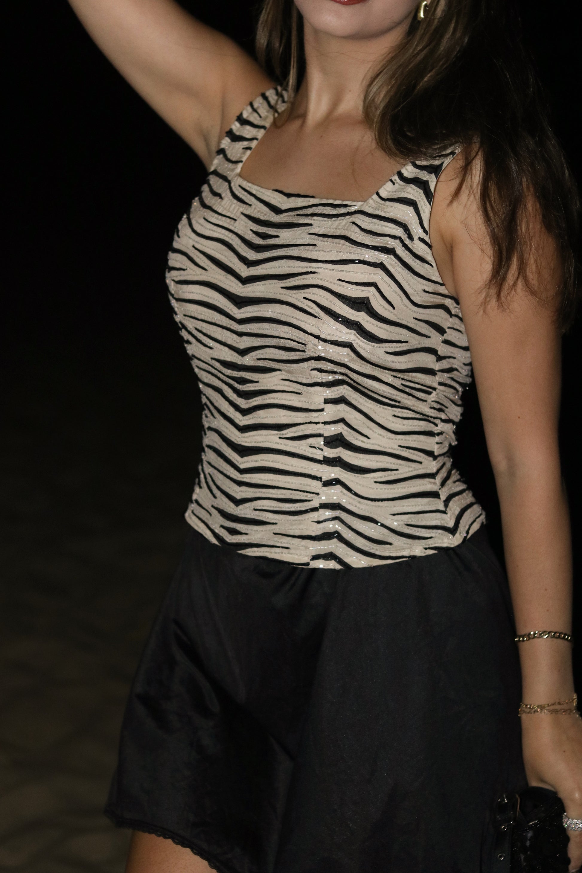 A vintage square neck, beaded, zebra printed top with the most stunning detailing! This is a true vintage piece with amazing quality and structure! This top is a size small and has no stretch at all. There is a zipper and hook and eye closure in the back.