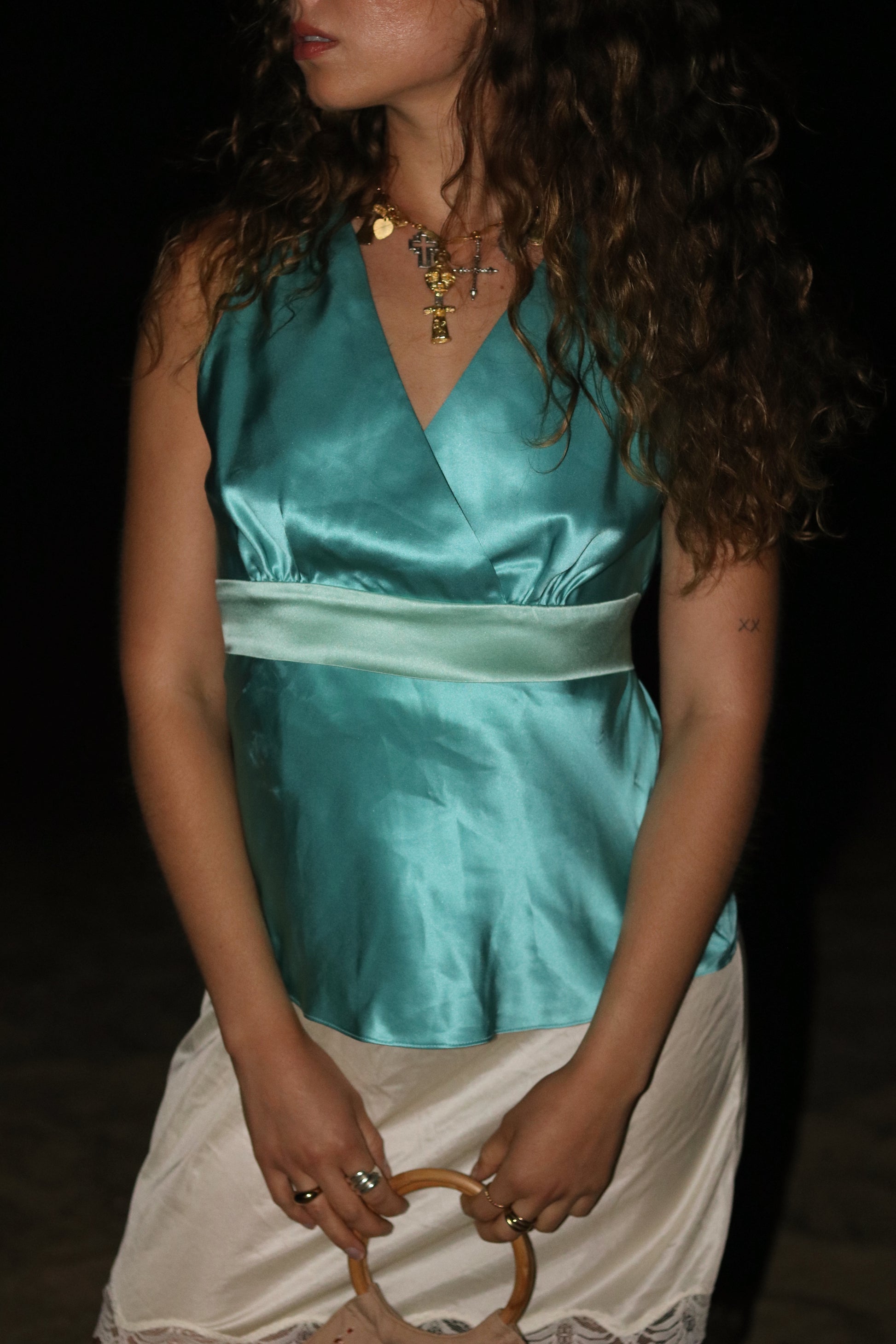 This silk tank is here to give you all a throwback to our childhood summertimes, with an aqua marine colored top. This top is a size Small.