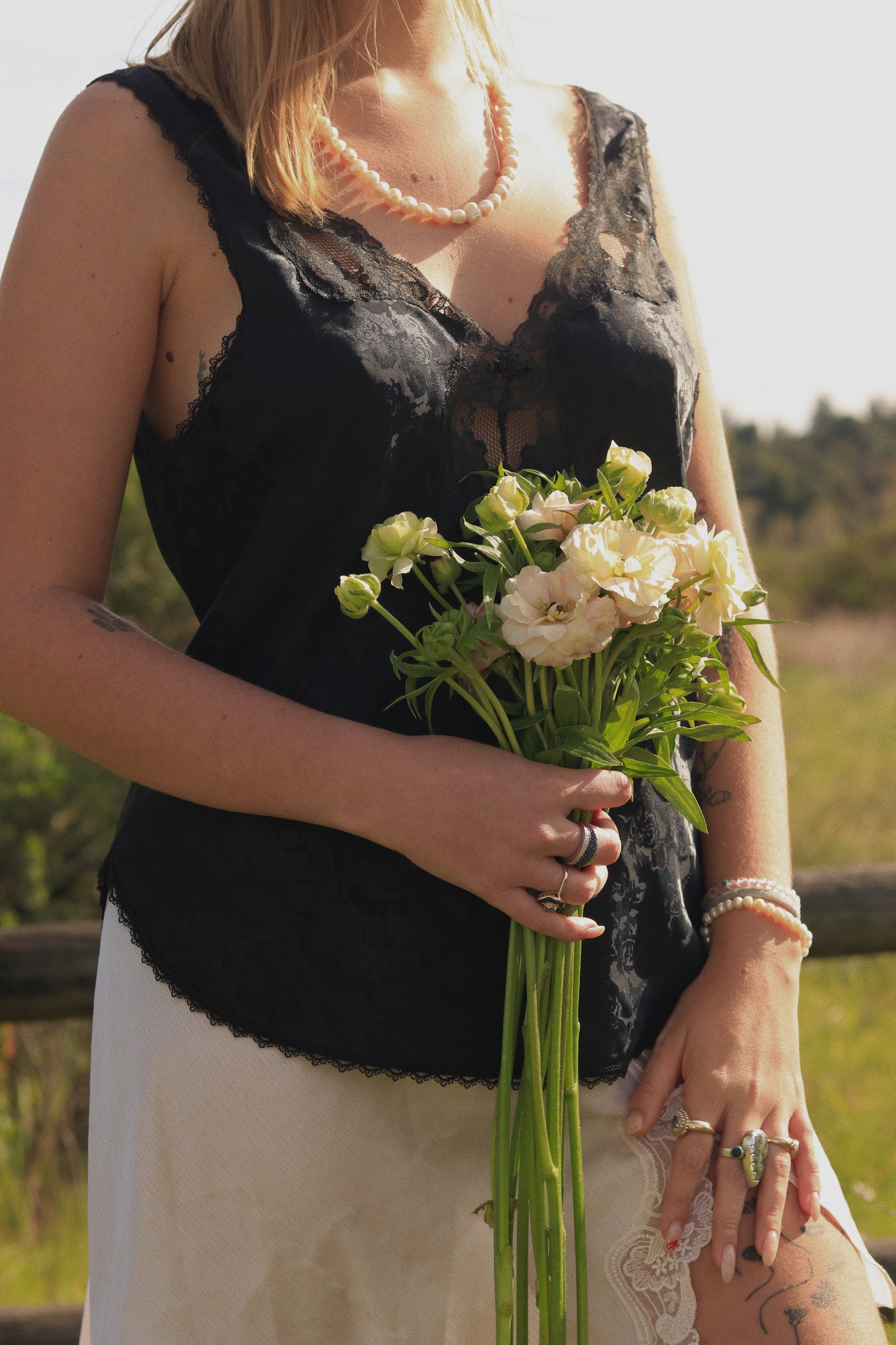 This tank has beautiful rose and floral detailing throughout the fabric. There is subtle detailing along the trim and a small floral appliqué on the chest.Pairs perfectly with the skirt in the photo. Size Medium.