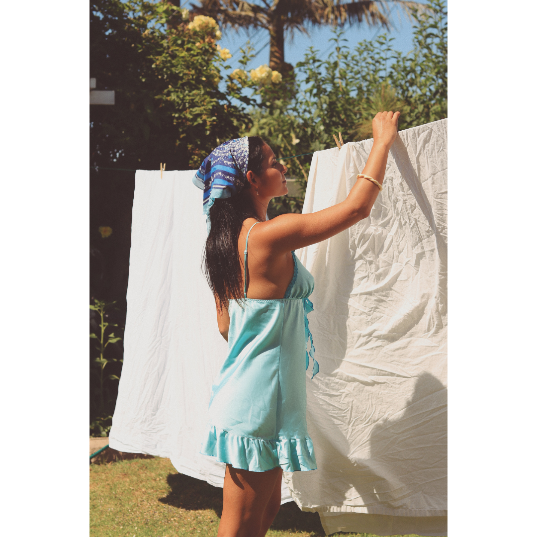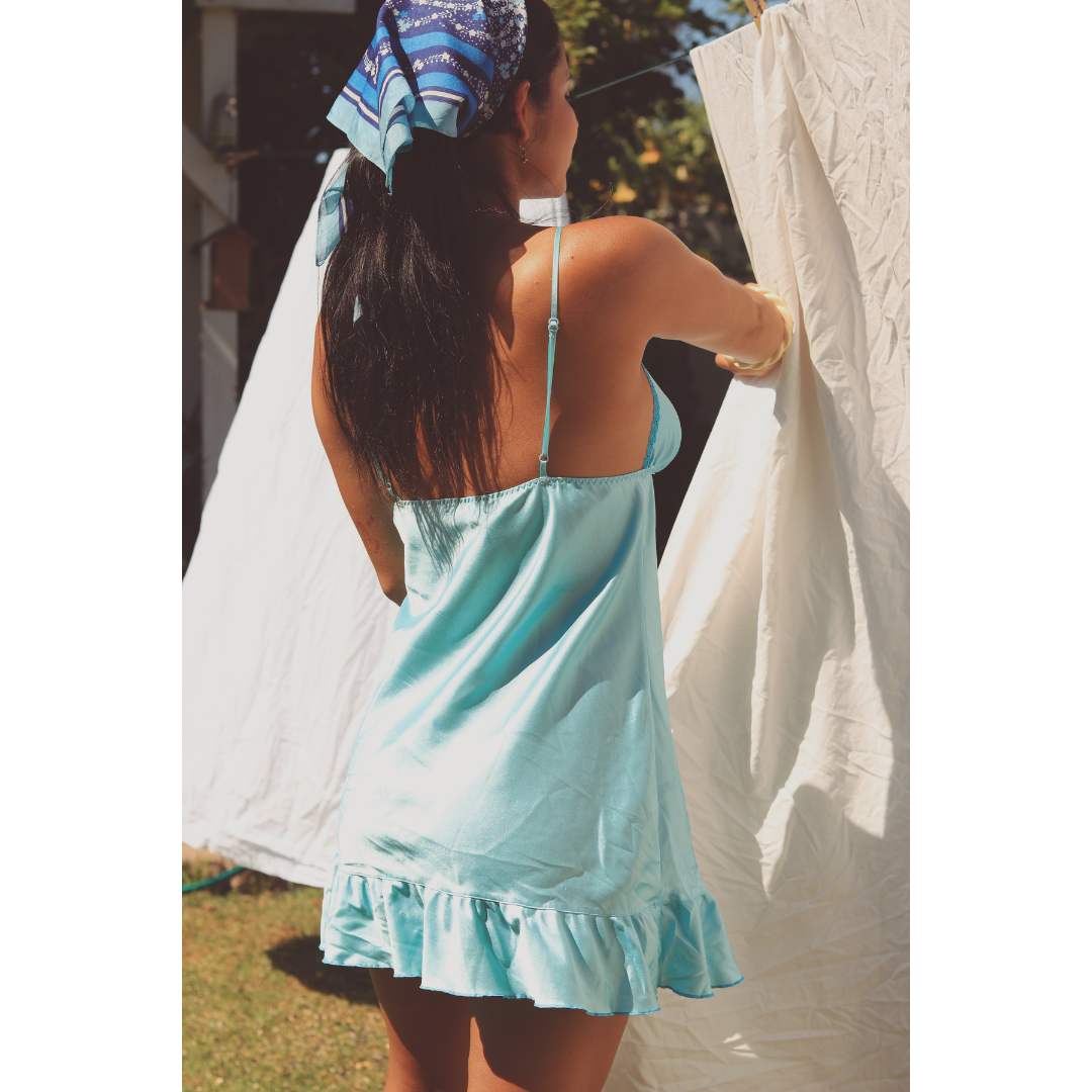 This is mid 2000's Victoria's Secret slip dress. This dress a stunning two toned blue slip, with contrasting lace detail along the top of the breast. This slip also has an adorable bow/ sash detail in the CF. This dress is a size small.