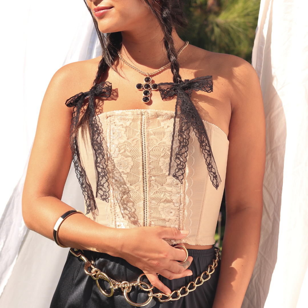 The Coquette corset, is a perfect corset for wearing something a bit more, fun while still maintaining simplicity. As this corset is a neutral tan color, it pairs perfectly with just about anything. It fits a size S/M, depends on bust sizing. This model is more so, a size small.
