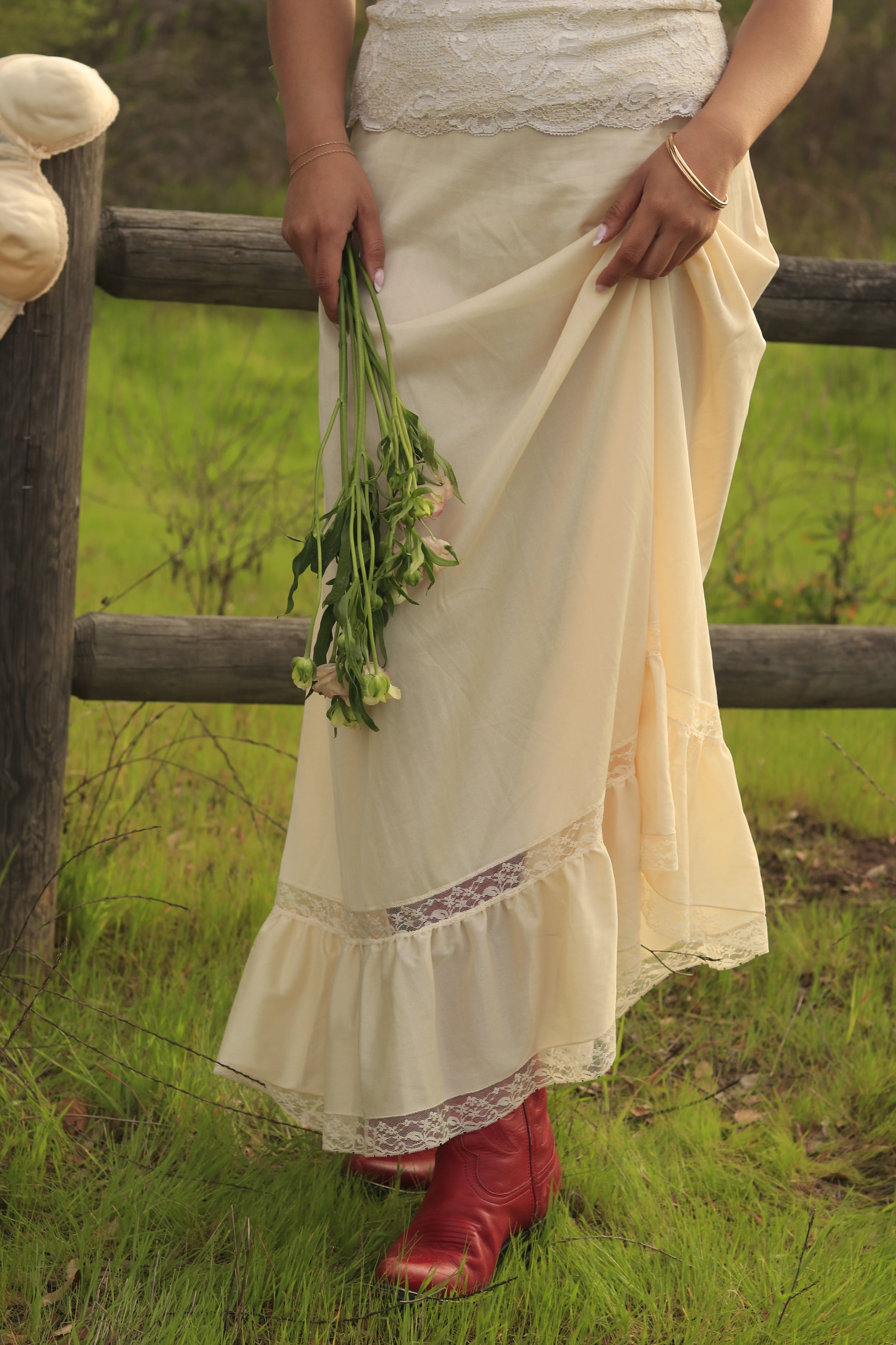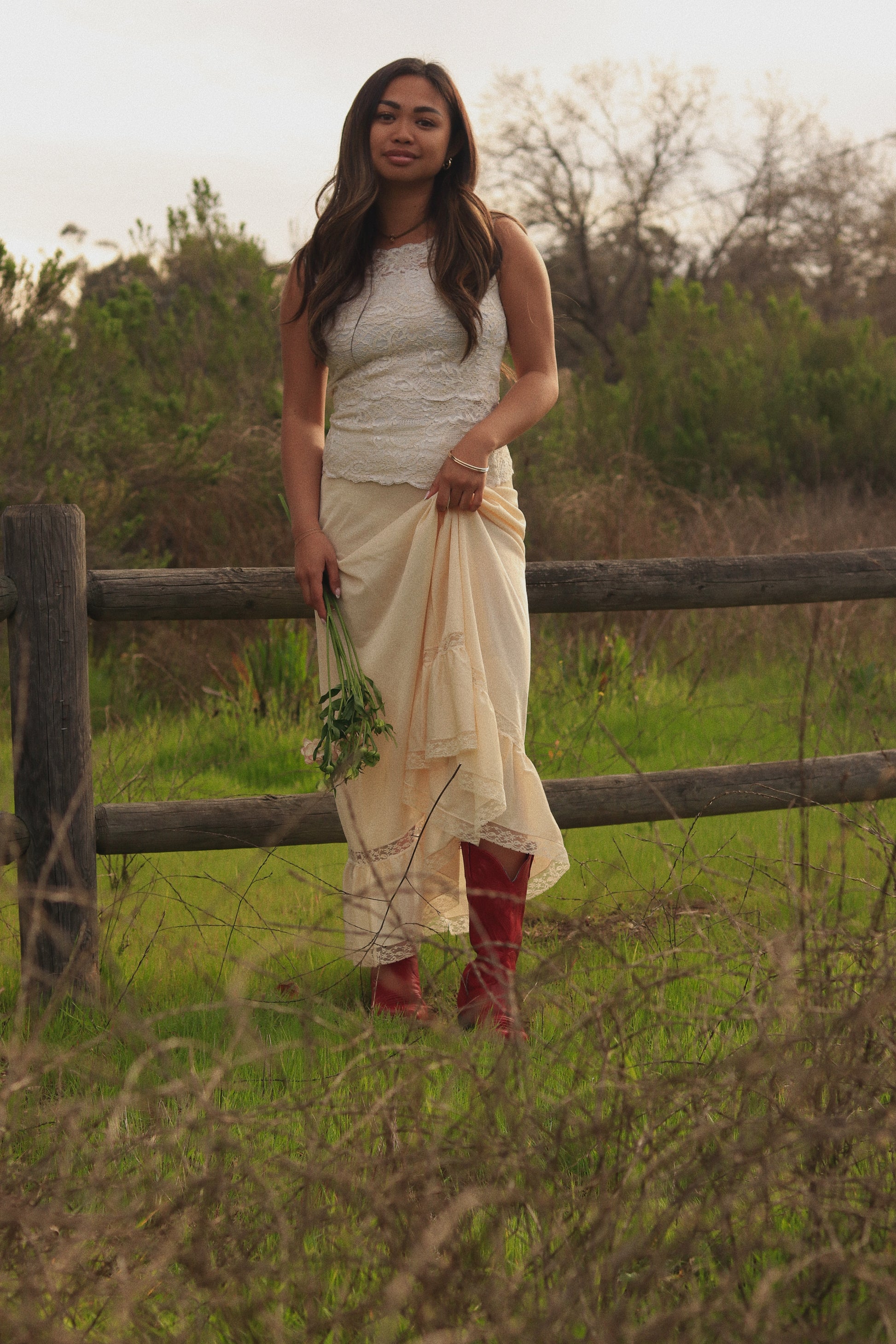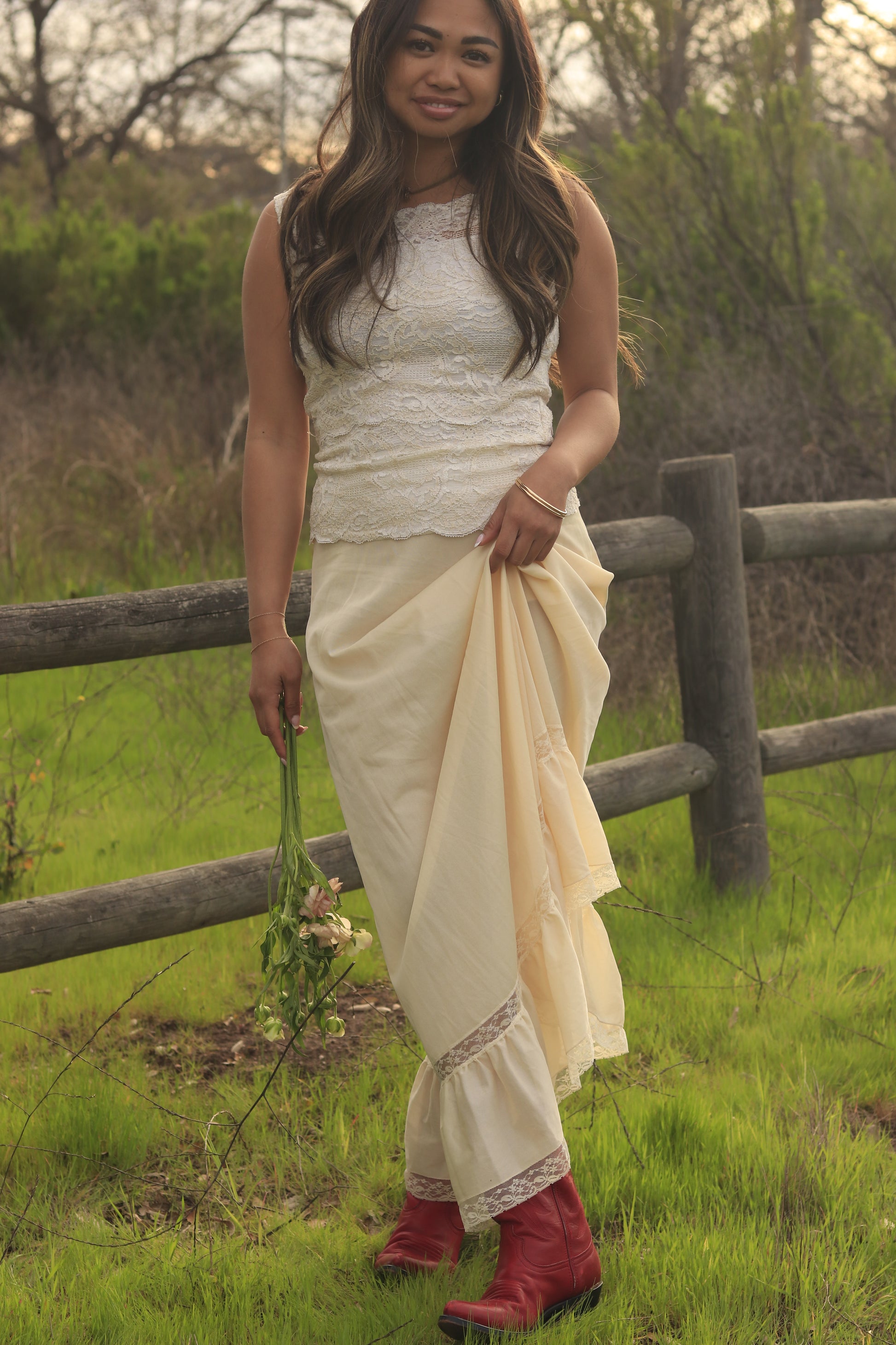 This cream vintage skirt is stunning in shape and has beautiful lace trimming, as well as a flowy ruffle along the bottom tier. This skirt is a S/M.