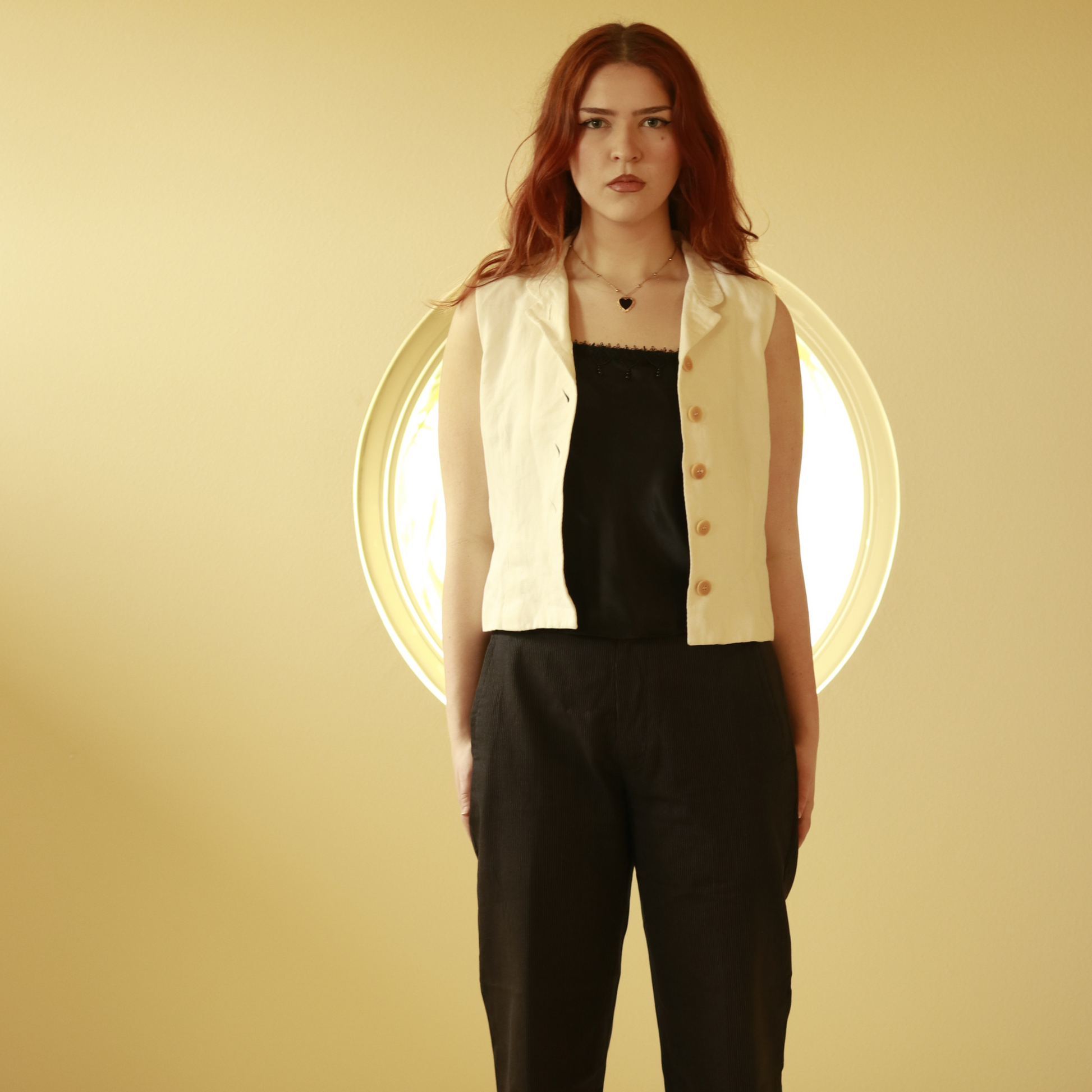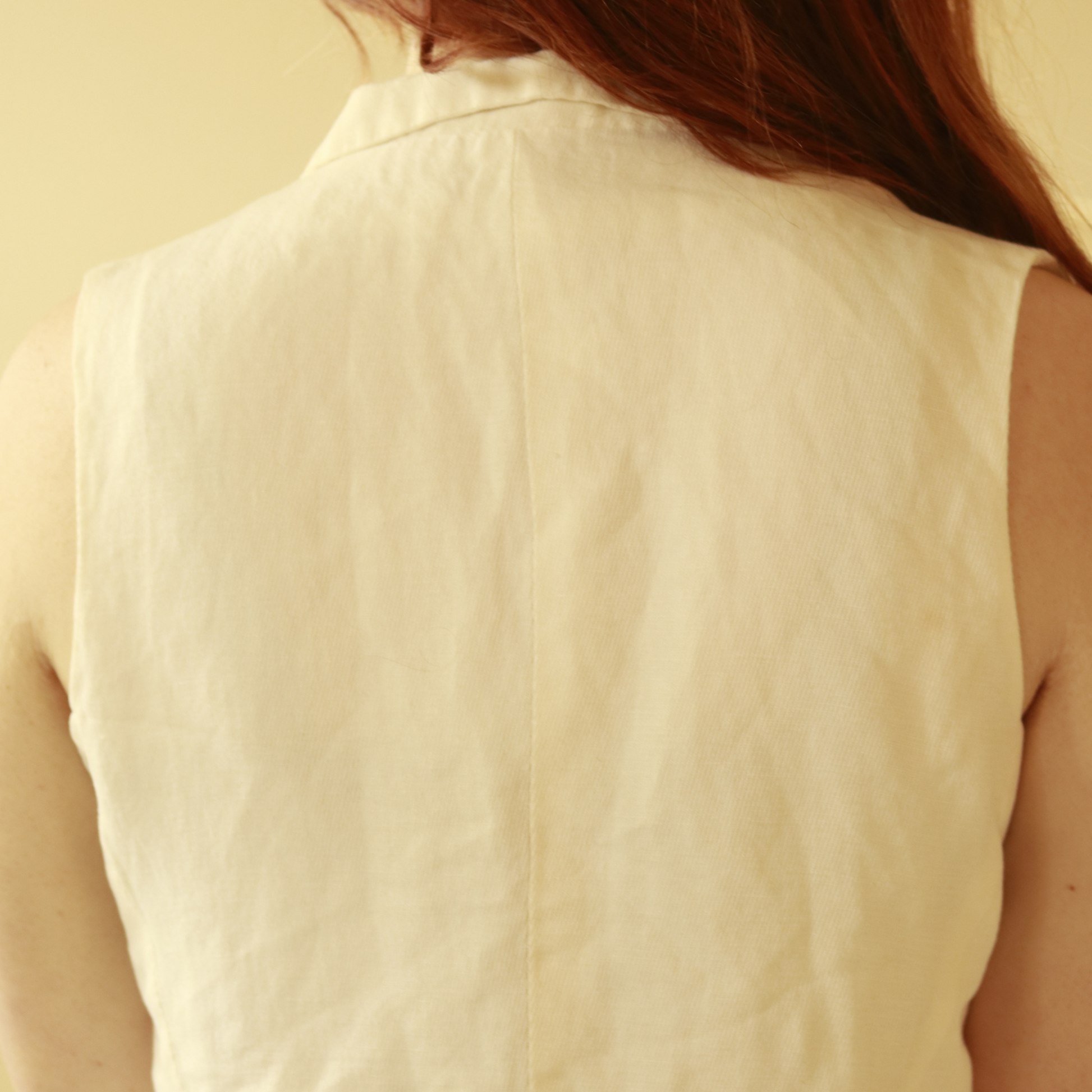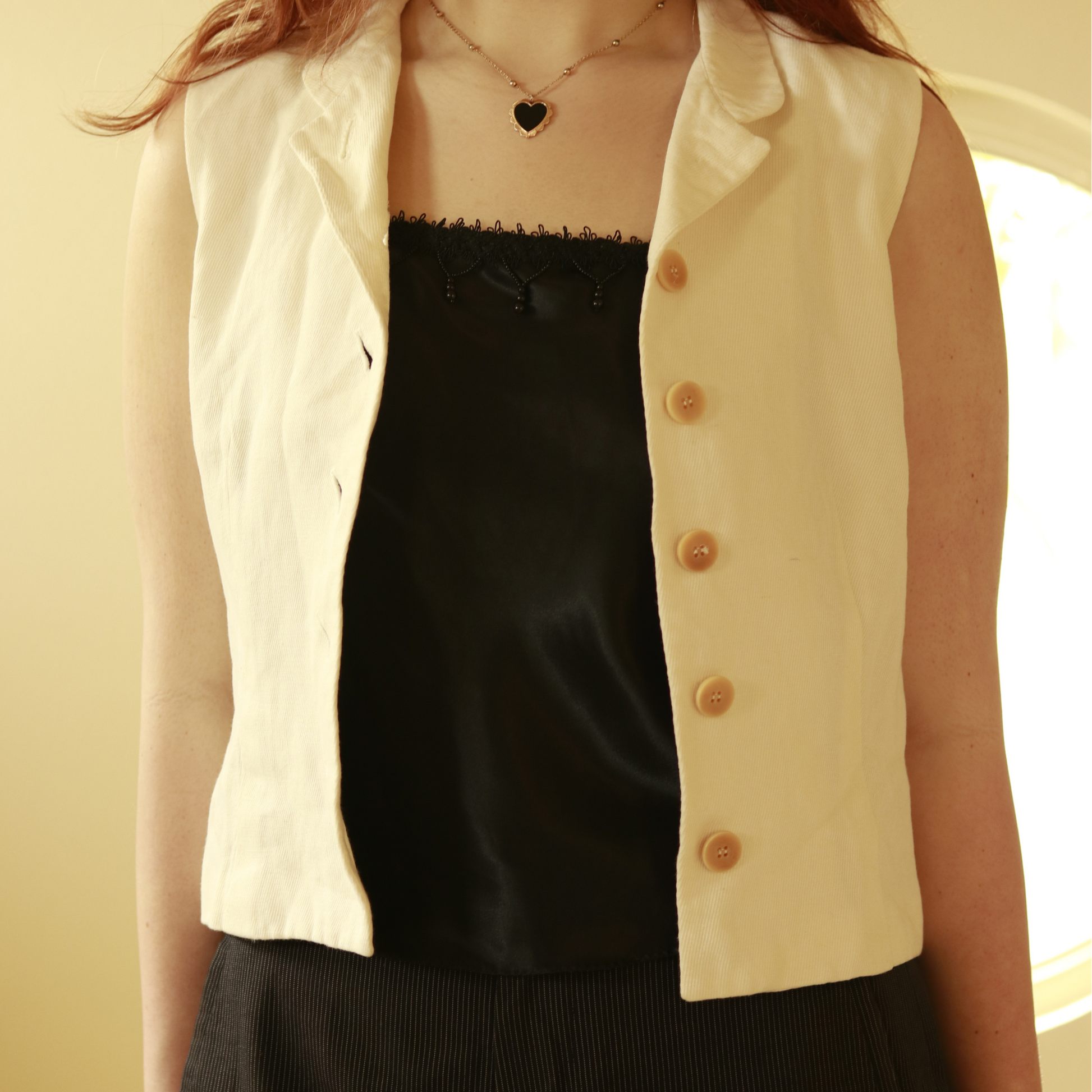 This Vest is perfect for both a vest and a top. This Vest has ivory buttons, and a mini notched collar. This piece is a perfect light staple to add to your spring/summer wardrobe.