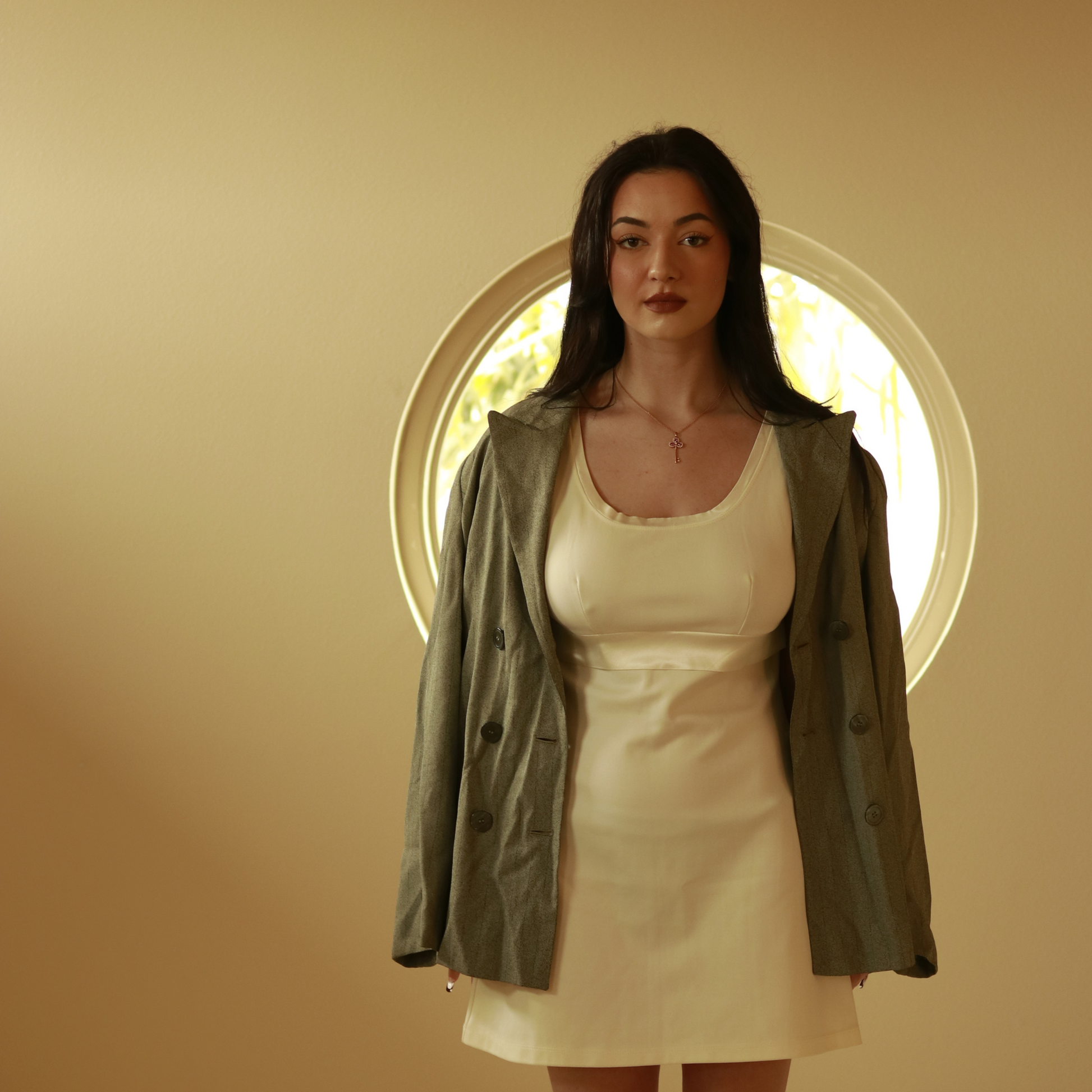 The Dear Darling Dress. This dress is simple, yet so chic. This is a mini dress, and fits the figure so well. This dress consists of satin trim around the neckline, bust darts, and a satin sash. As for size, this dress can fit a small. Our model is shorter, and on the petite side. Due to her height the dress does fall lower on her legs.