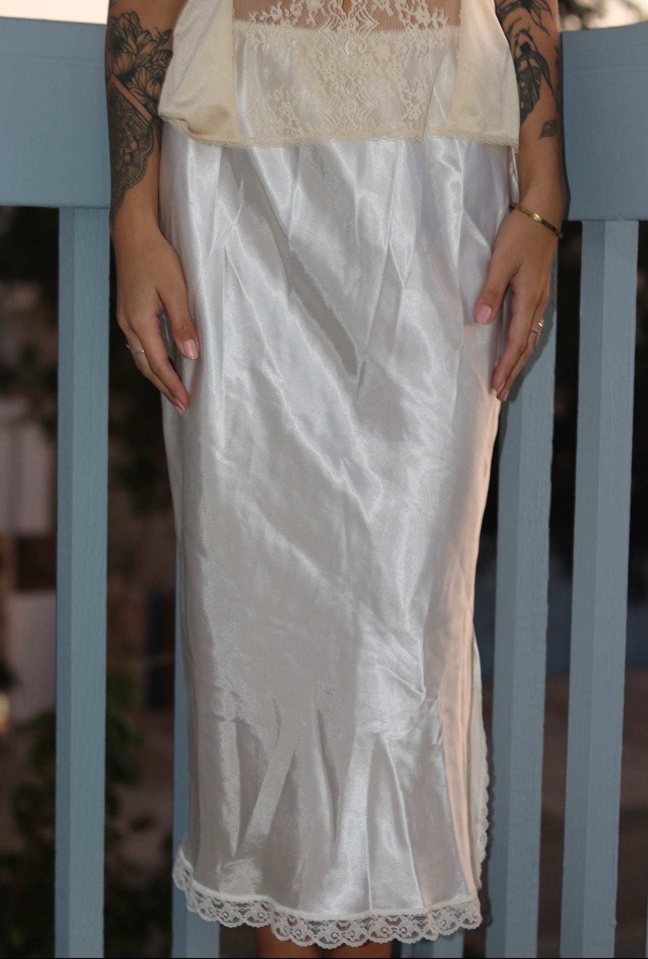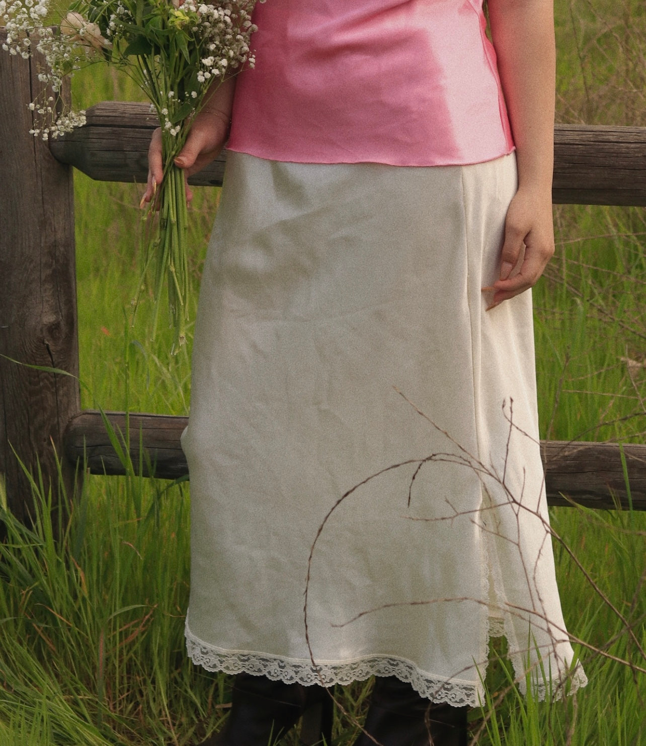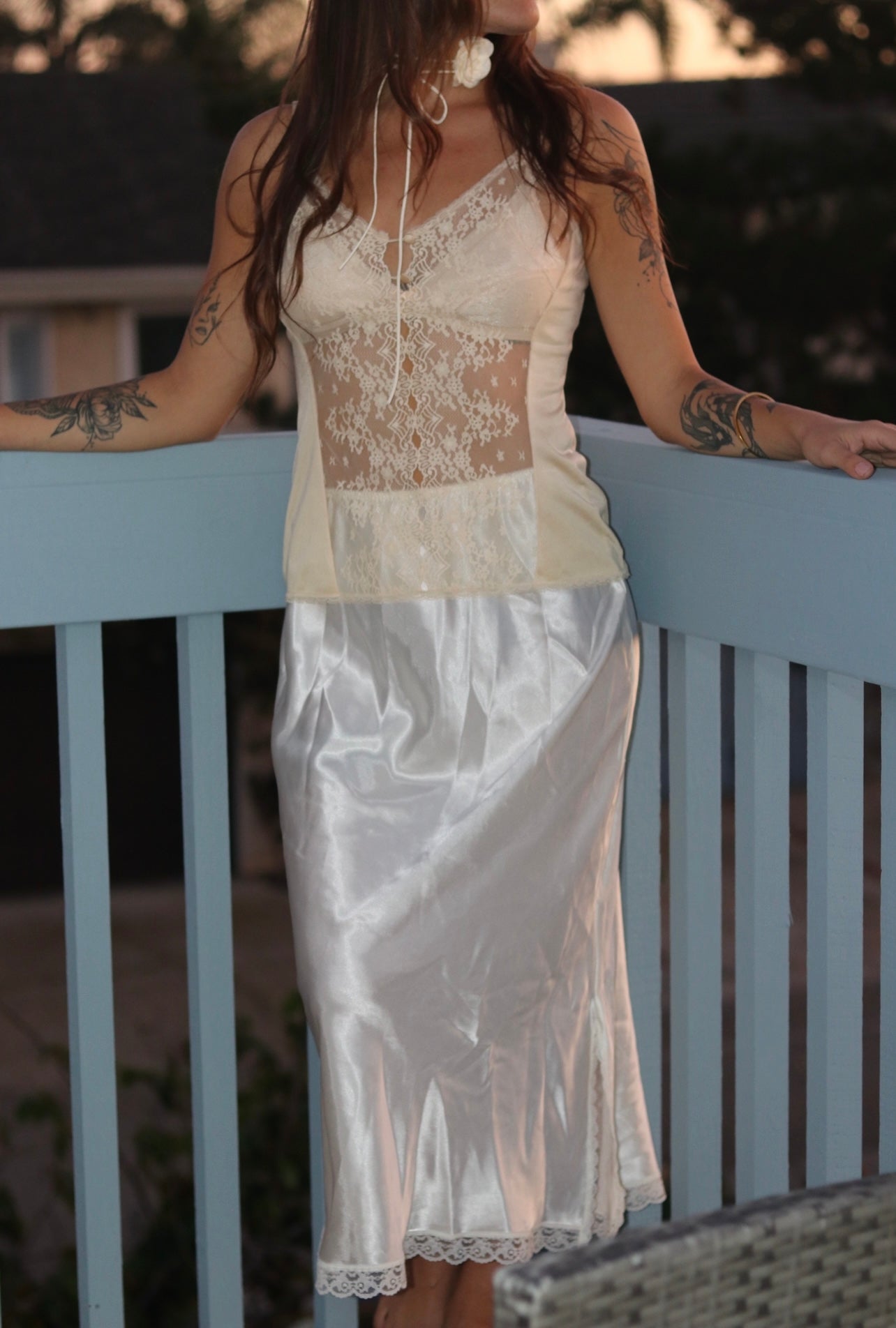 A stunning slip skirt with lace trim along the bottom. This skirt is so pretty paired with a white or neutral tones top for a cottage core look, or with The Tulip Top for a spring look. This skirt is a S/M.