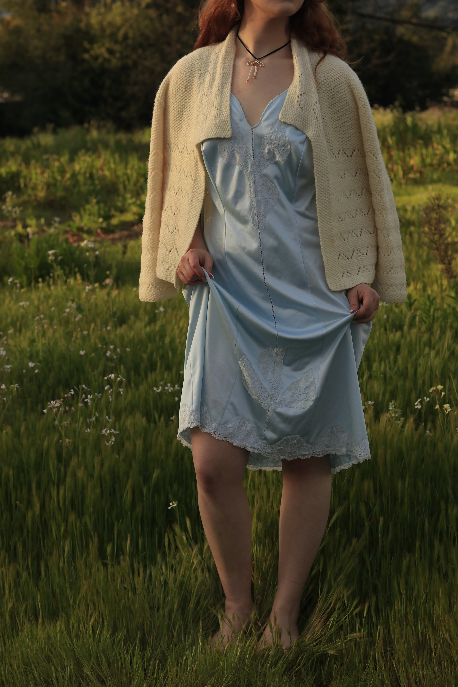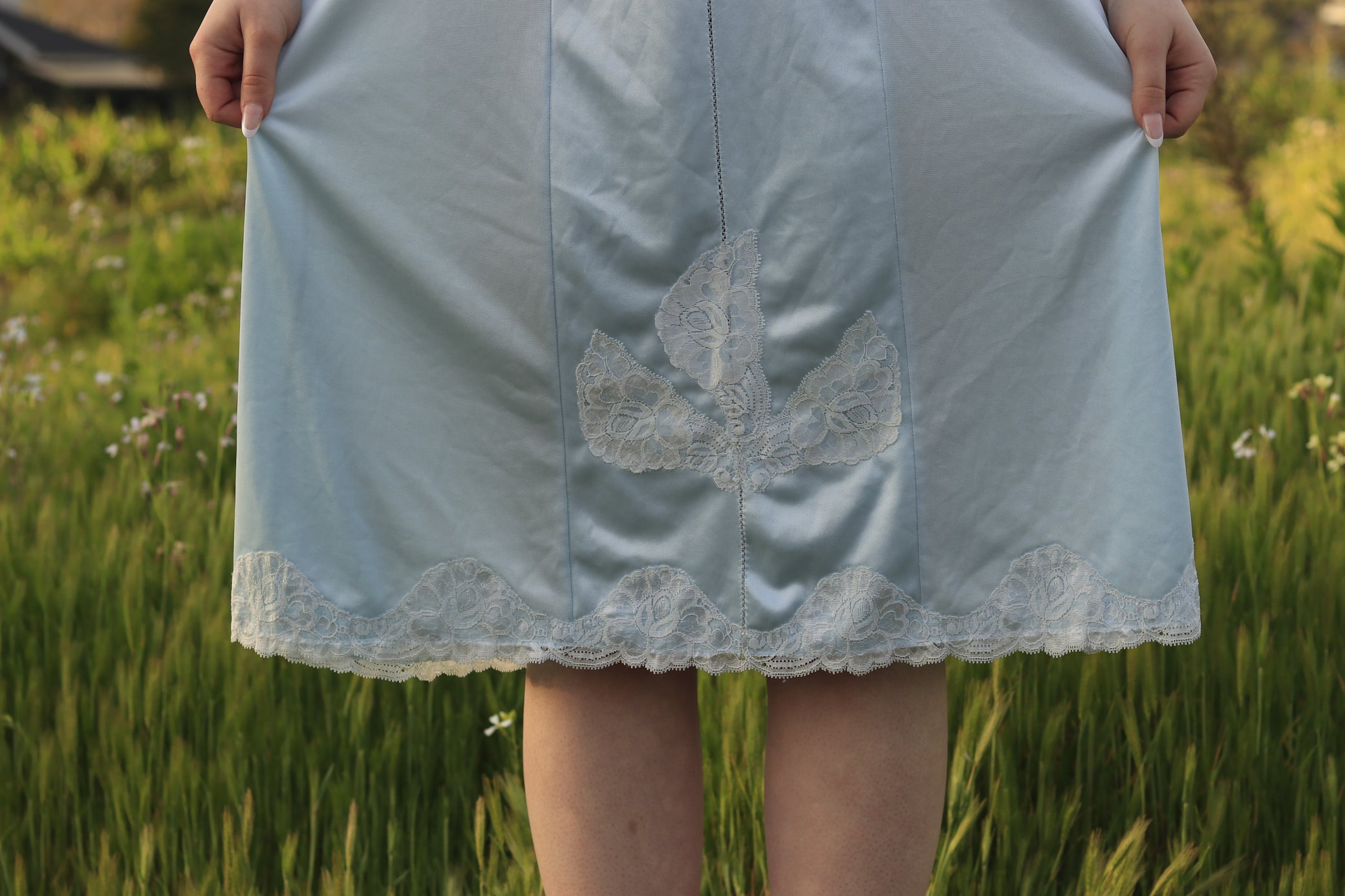 This vintage gown is a nice light and airy slip dress perfect for a spring outfit or even for sleep! It has beautiful white lace detailing at the bottom, as well as lace detailing throughout. This slip is a Large.