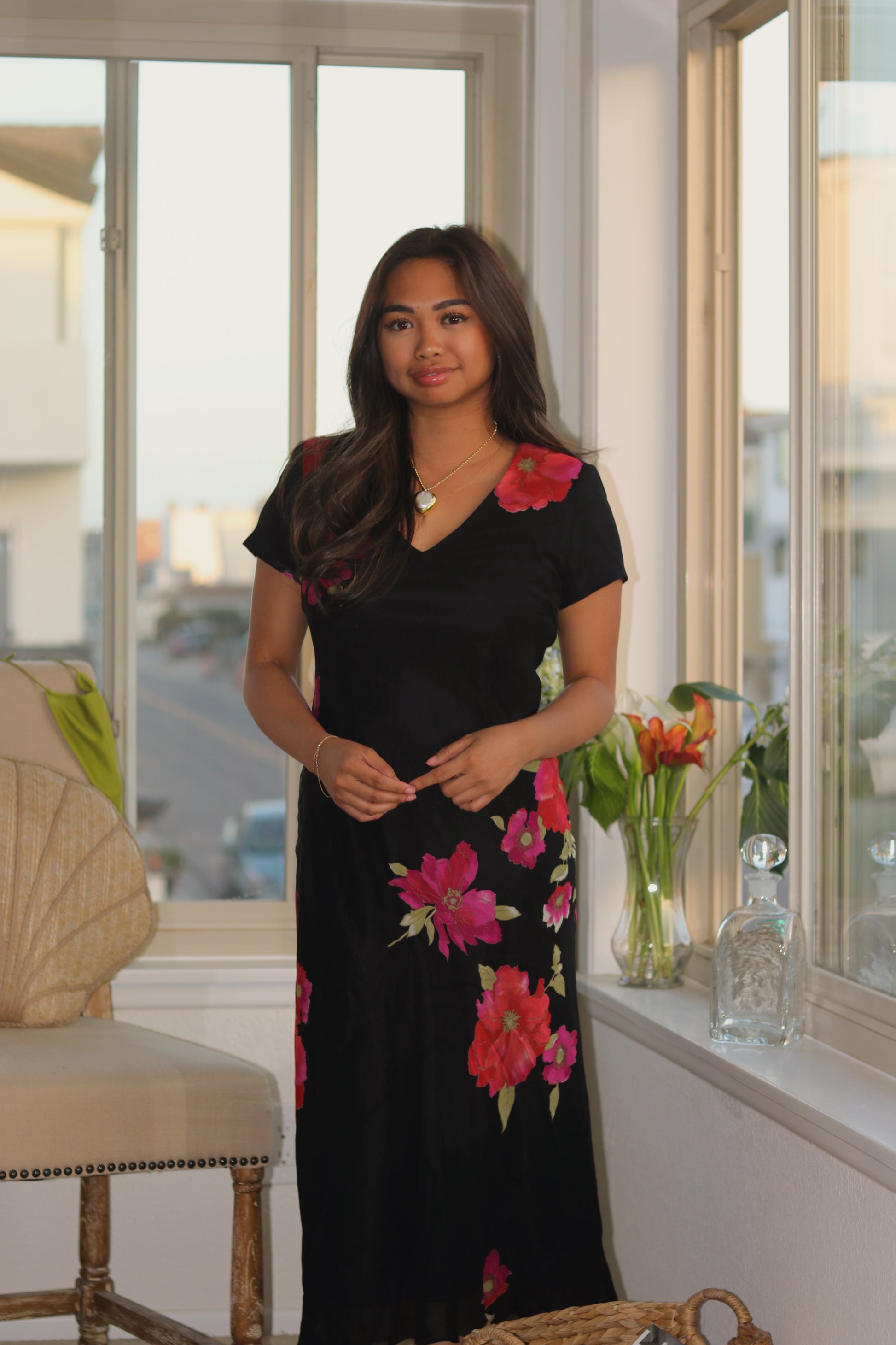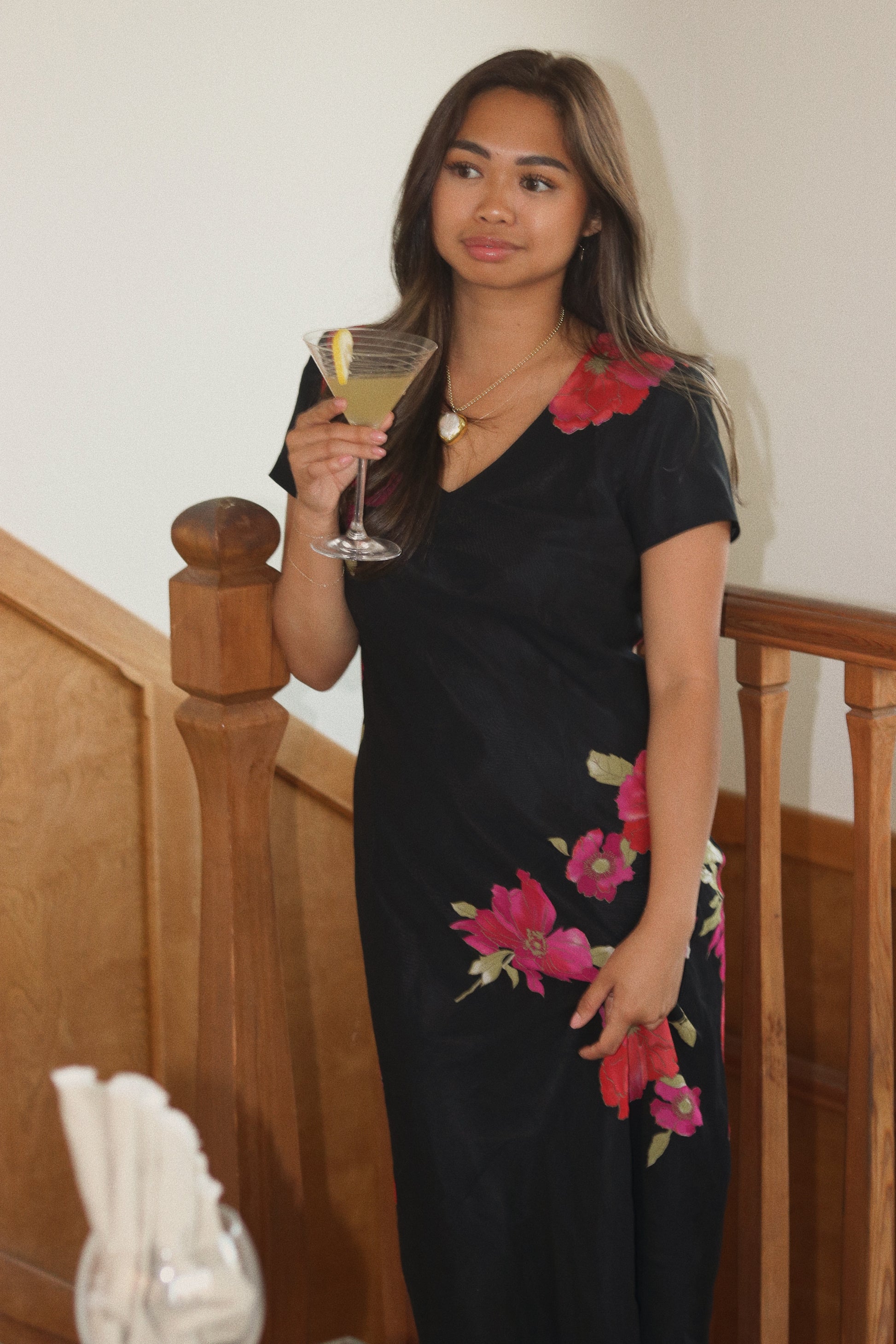 This 90’s dress has beautiful bright flowers placed all over the dress. This would pair perfectly with some platform shoes. This dress is a size 8. The model is a size small.