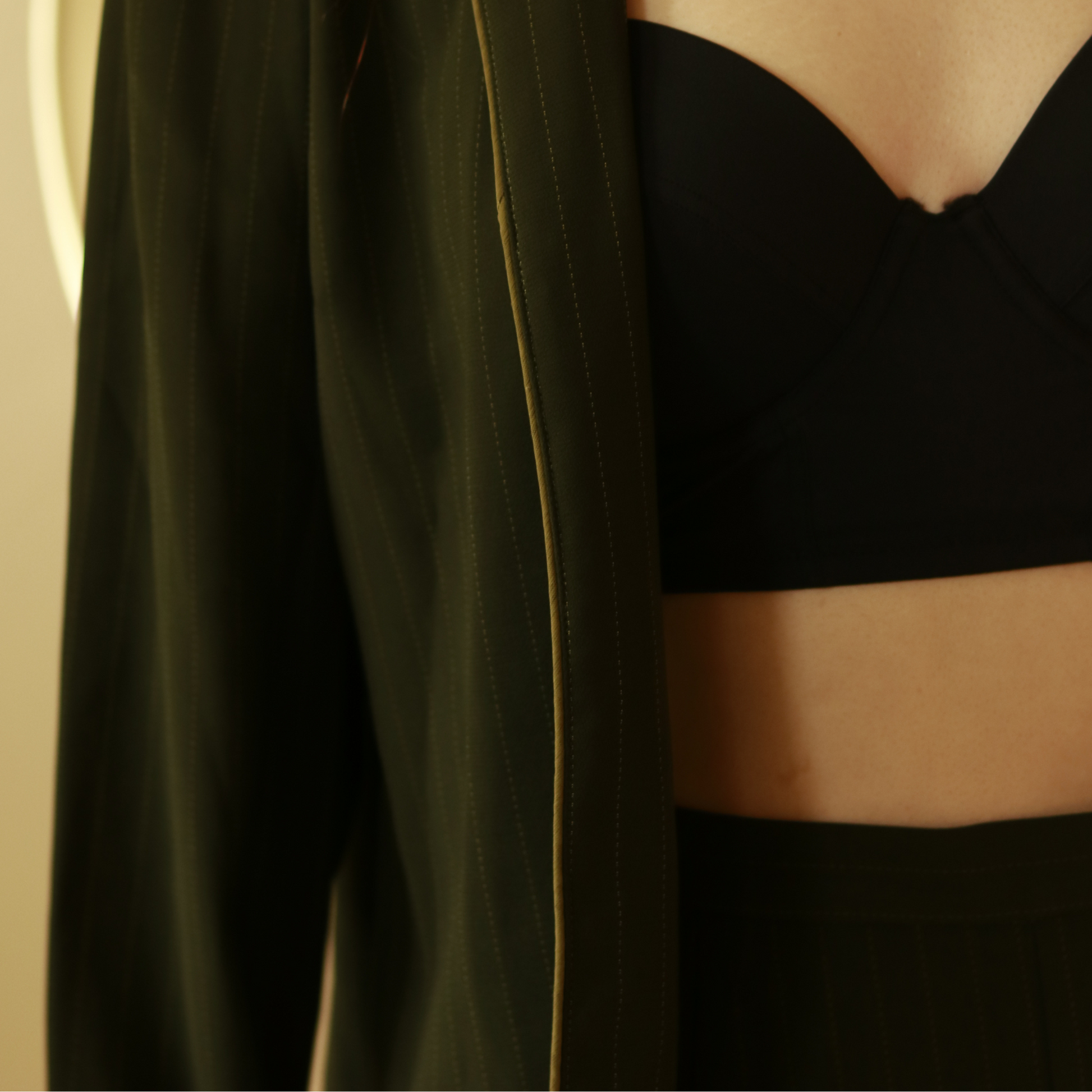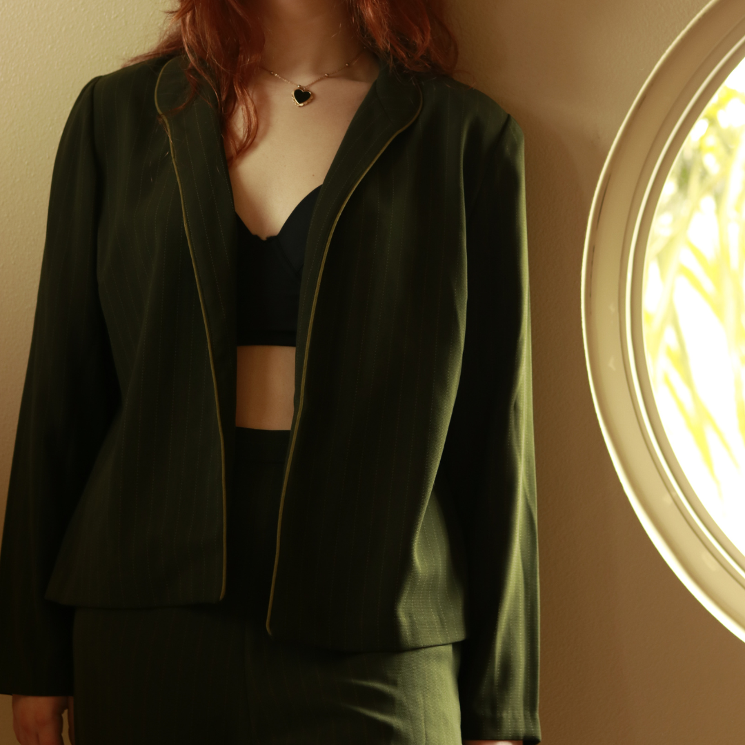 The Lemon Grass Blazer is a green two toned blazer. This blazer is dark green with lime green contrast pin stripes. There are no buttons along the front or inside of this jacket. The most exciting part of this blazer is the fact that there is a matching pair of suit pants that go with this blazer. This fabric is light, and fits loosely rather than stiff on the body. Pair this blazer, or set with a pair of fun shoes and a crop top.\