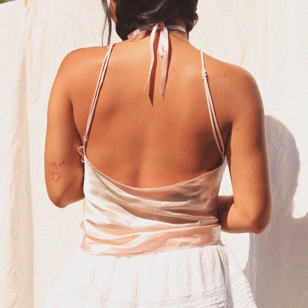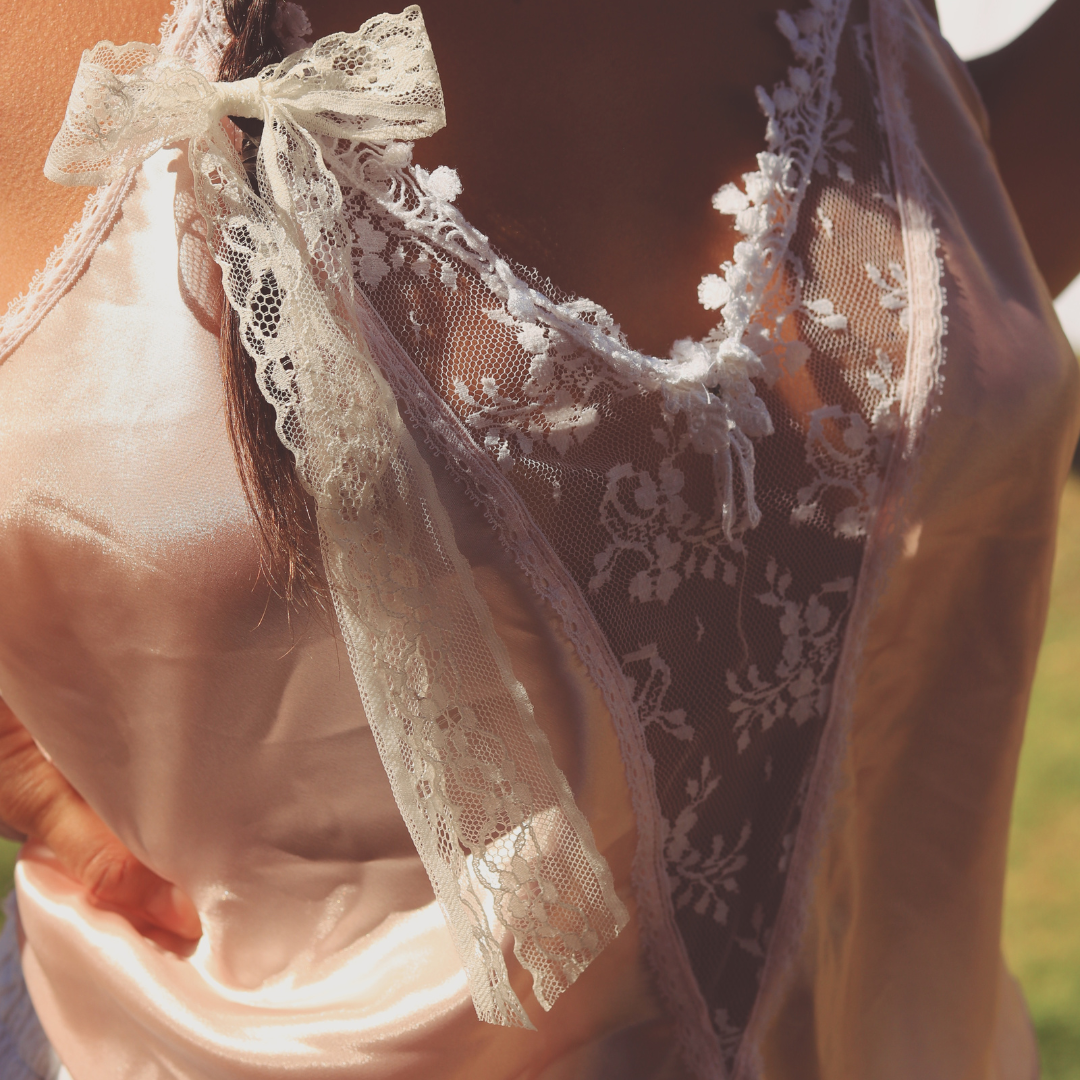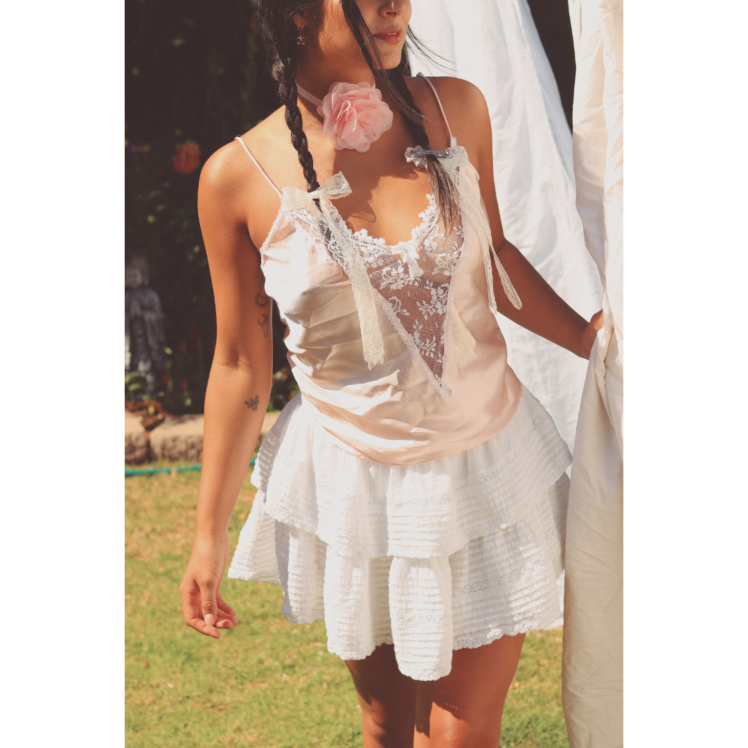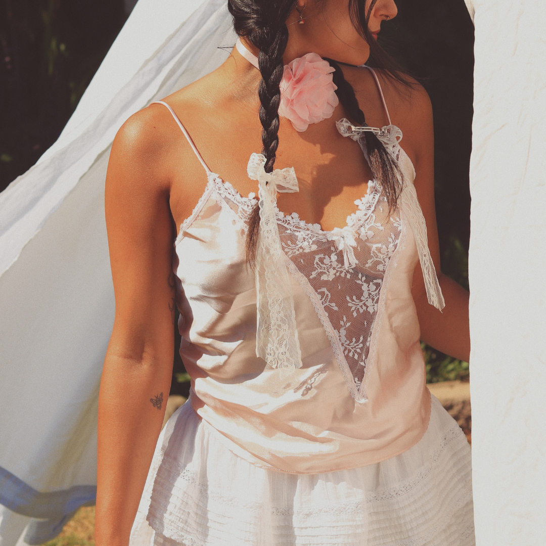 This stunning, and very unique slip top is an amazing vintage piece. This top has gorgeous lace detailing. This top has a drop back, as well as lace paneling. This top is a light, baby pink tone, and fits a size medium.