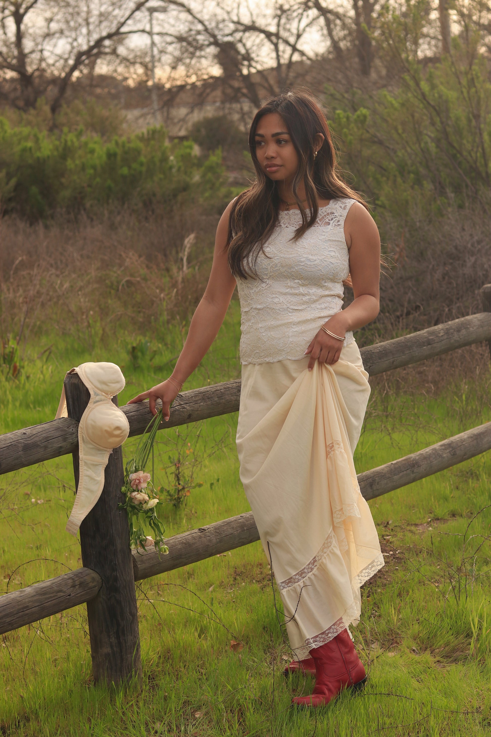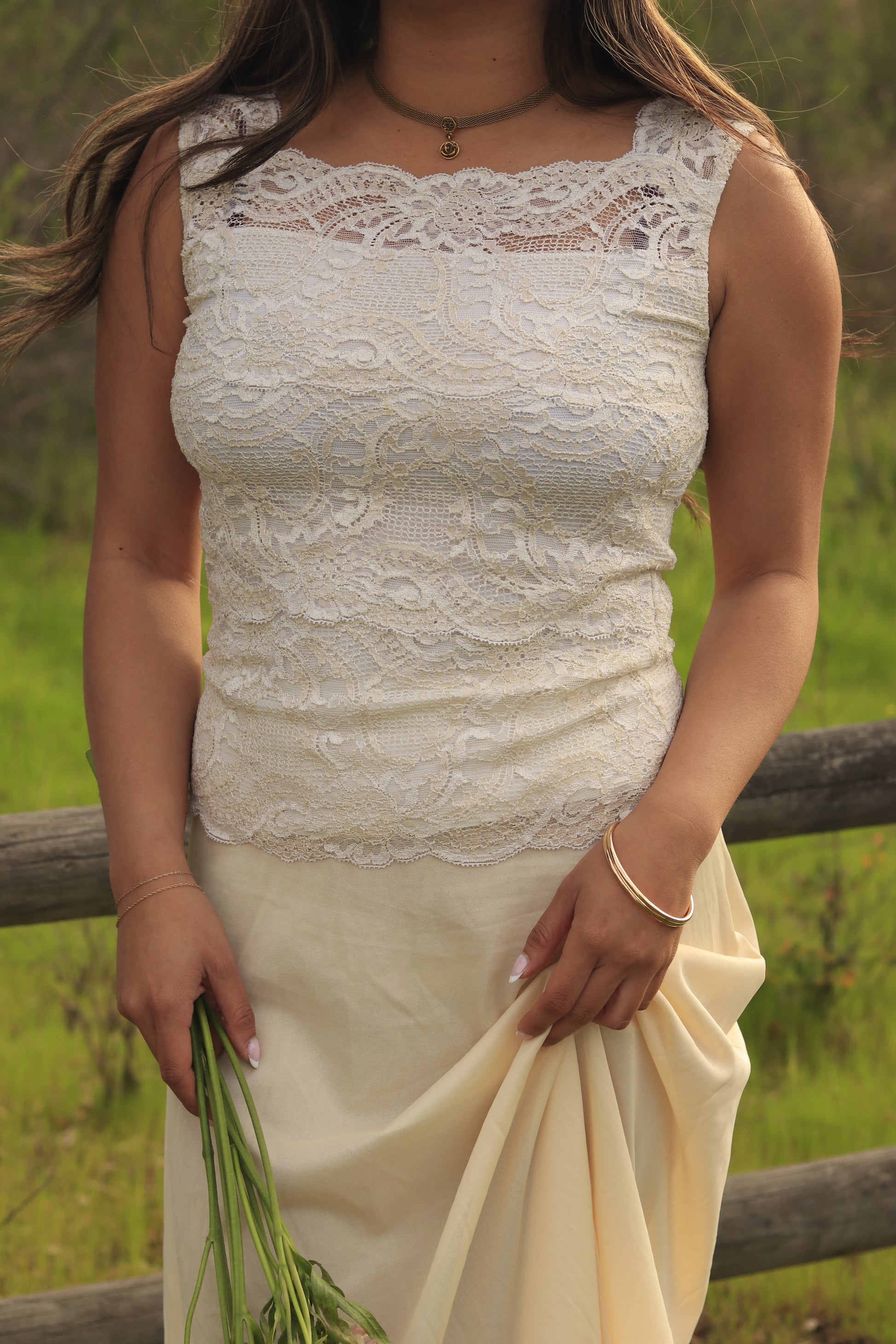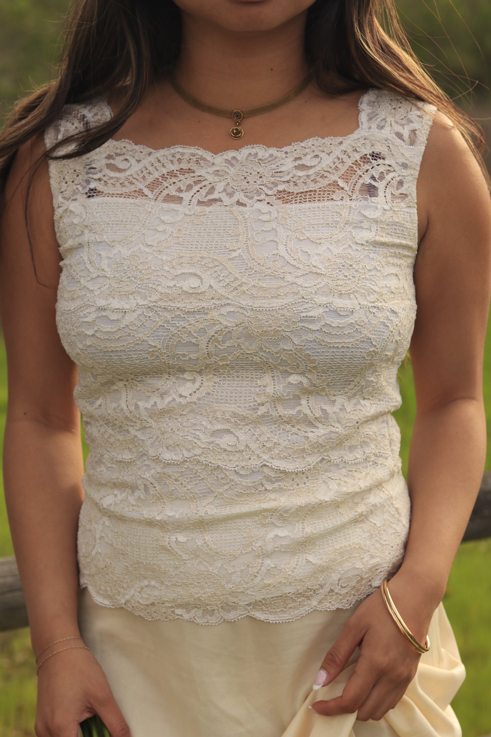 The Michelle Top is an adorable vintage cream lace tank top. This top is stunning paired with a cream skirt and contrasting boots or heels. This top is a size Small, but can fit S/M.