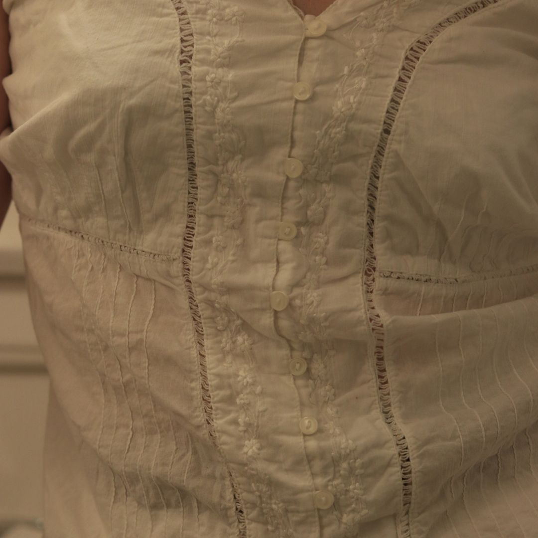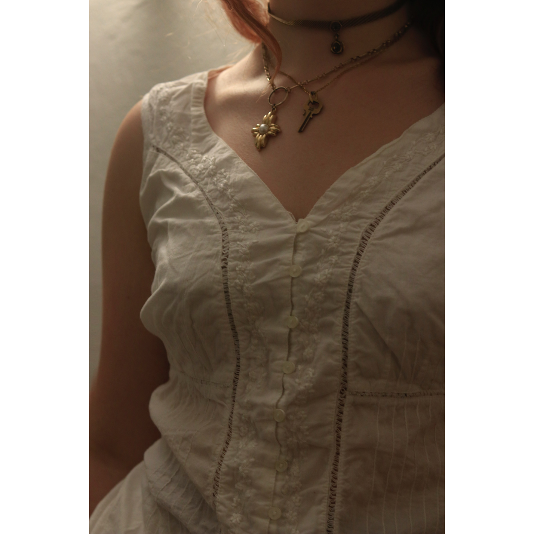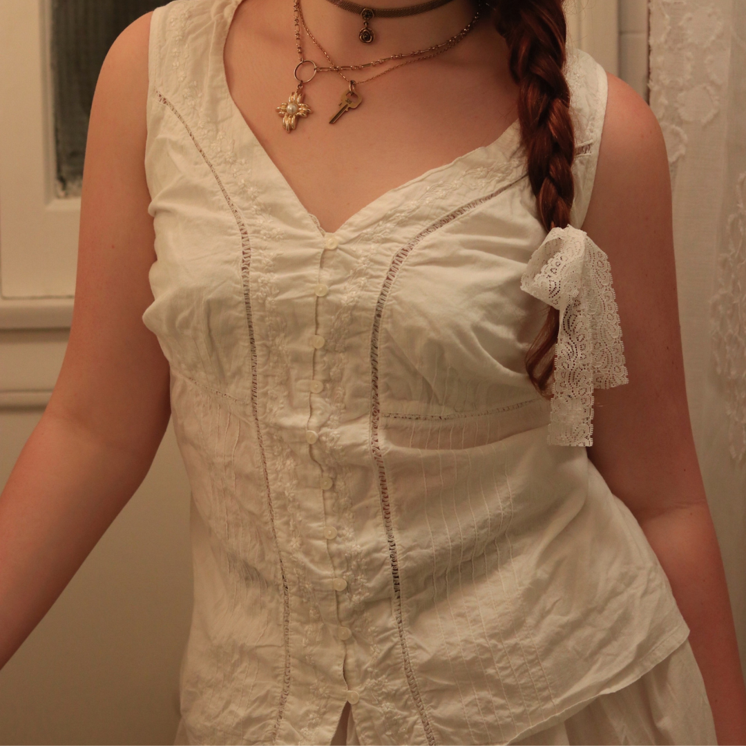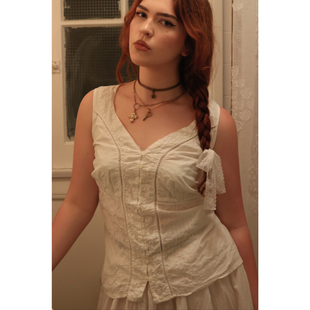 The Milk maid top is a stunning vintage top, with detailing along the entire CF. This top still alines with the coquette aesthetic perfectly. This top fits about a L-XL. This top is loose, and quite stunning.