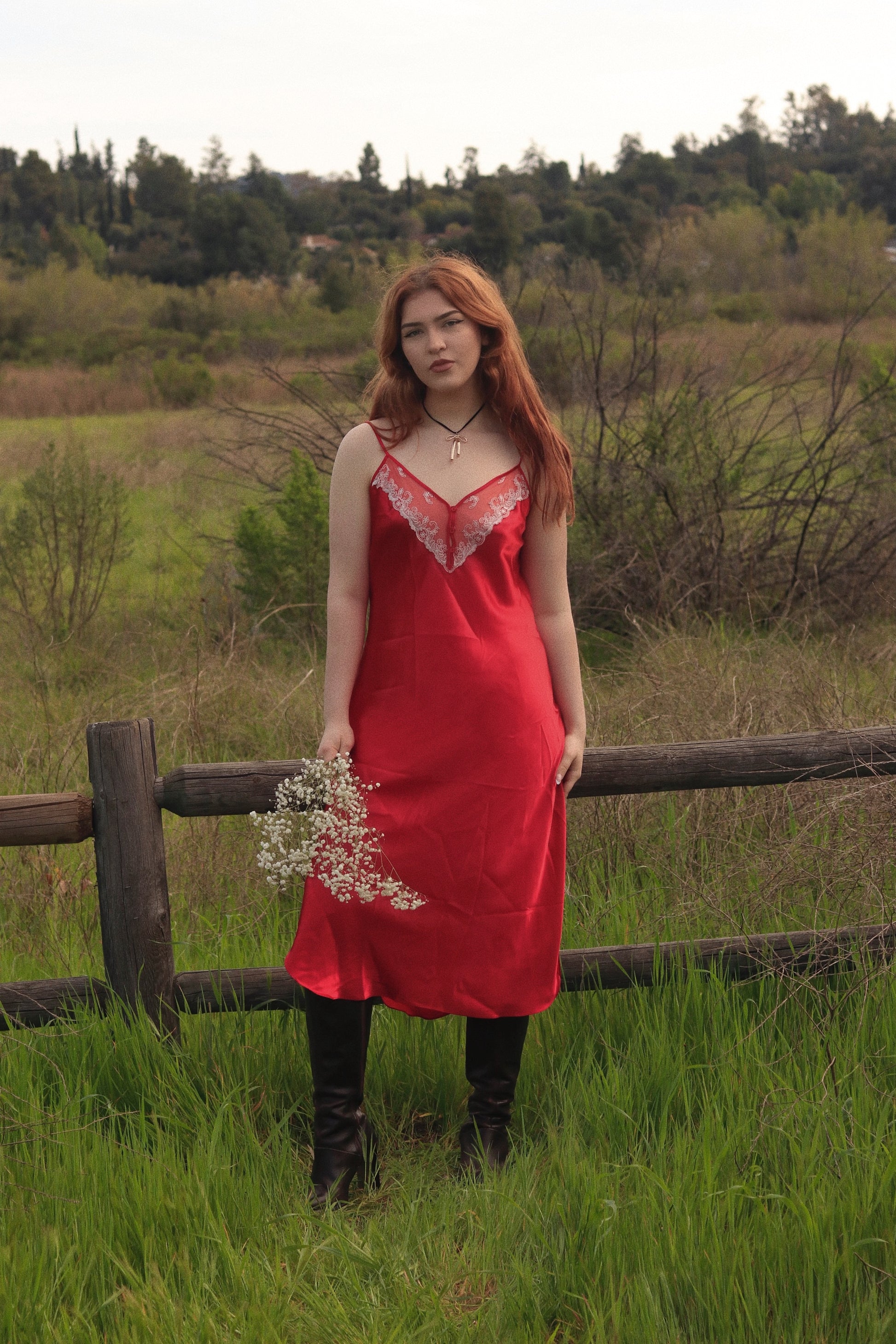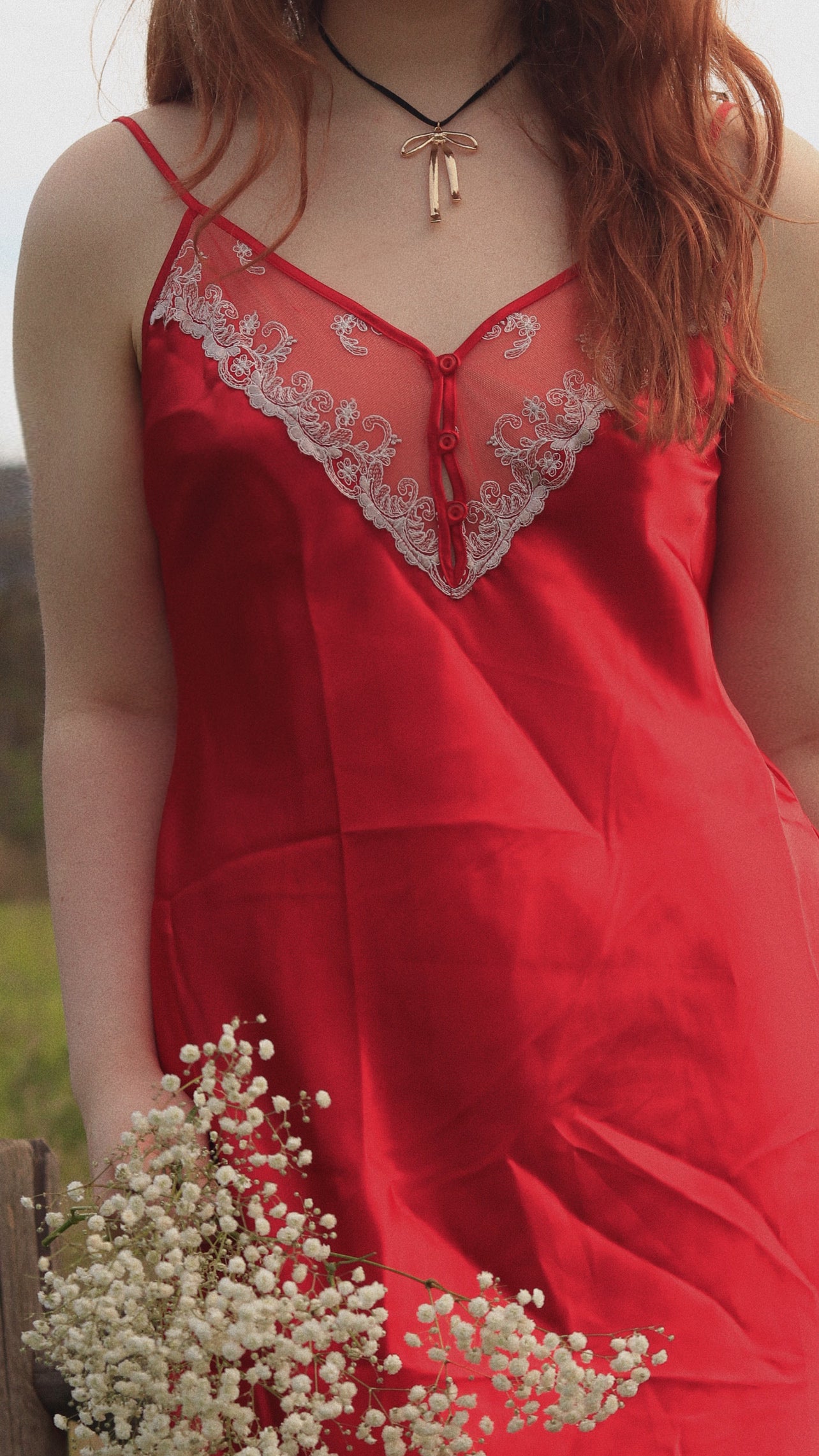 The Picnic Dress is a stunning red slip dress with white lace contrast detailing and button detailing along the neckline. This slip fits like a M/L.