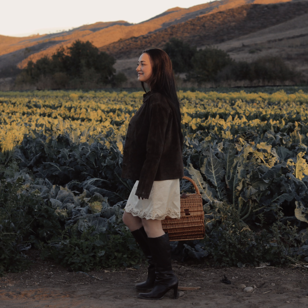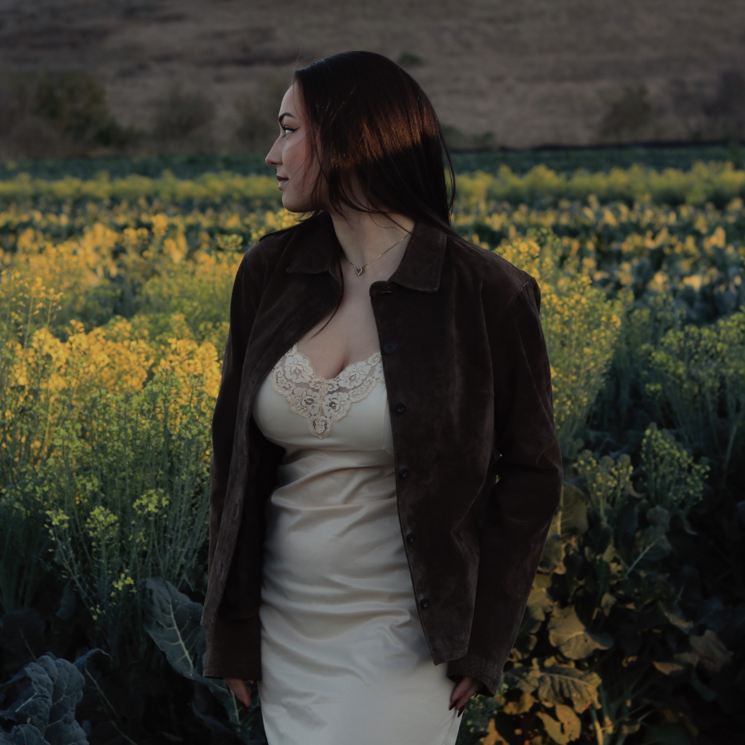 This jacket is labeled as a size small, but it has a relaxed fit that comfortably accommodates a medium. The model is a small/medium and stands on the shorter side, showcasing how the jacket flatters various body types.