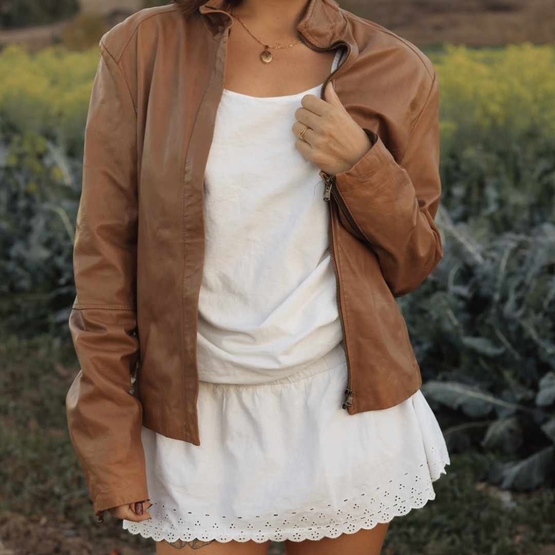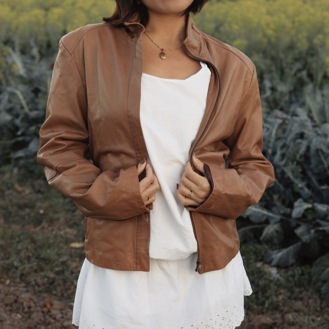Discover the elegance of the Serena Leather Jacket, a beautifully crafted light brown moto leather jacket made in Italy. This luxurious leather jacket offers a more subtle, feminine vibe compared to traditional leather jackets, making it the perfect choice for daywear or casual outings. The soft, light brown tone complements various outfits, adding a sophisticated touch to your wardrobe.