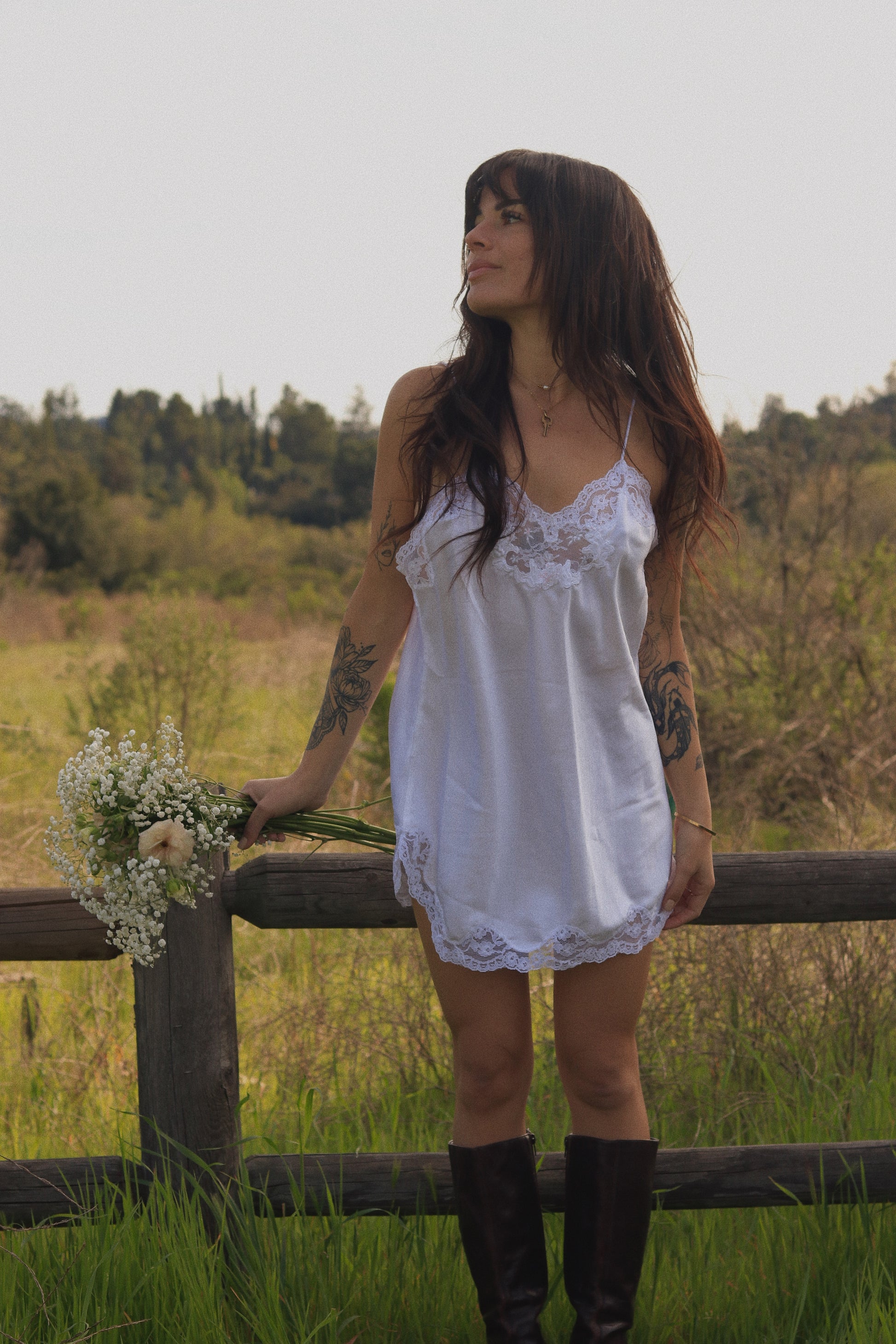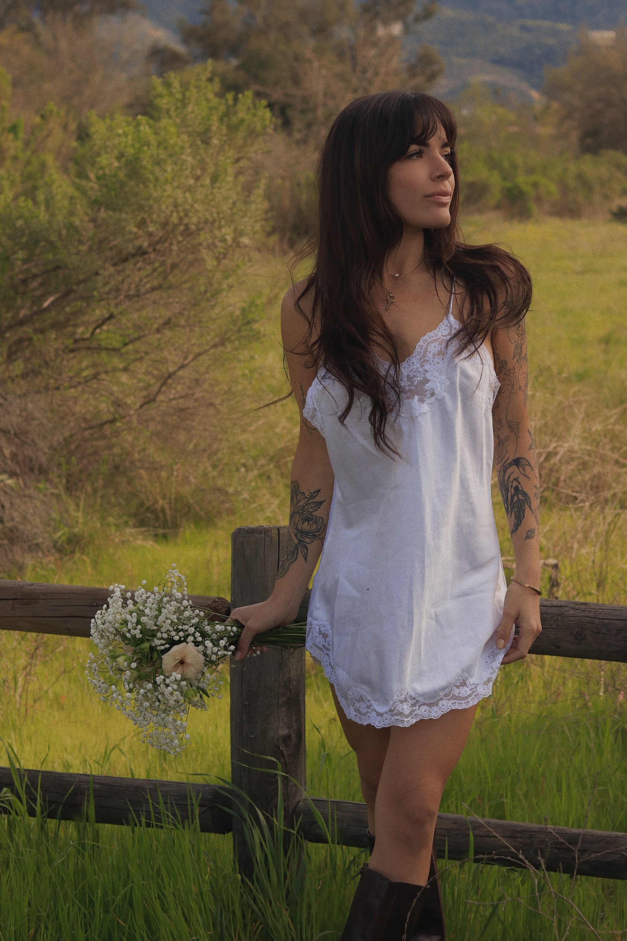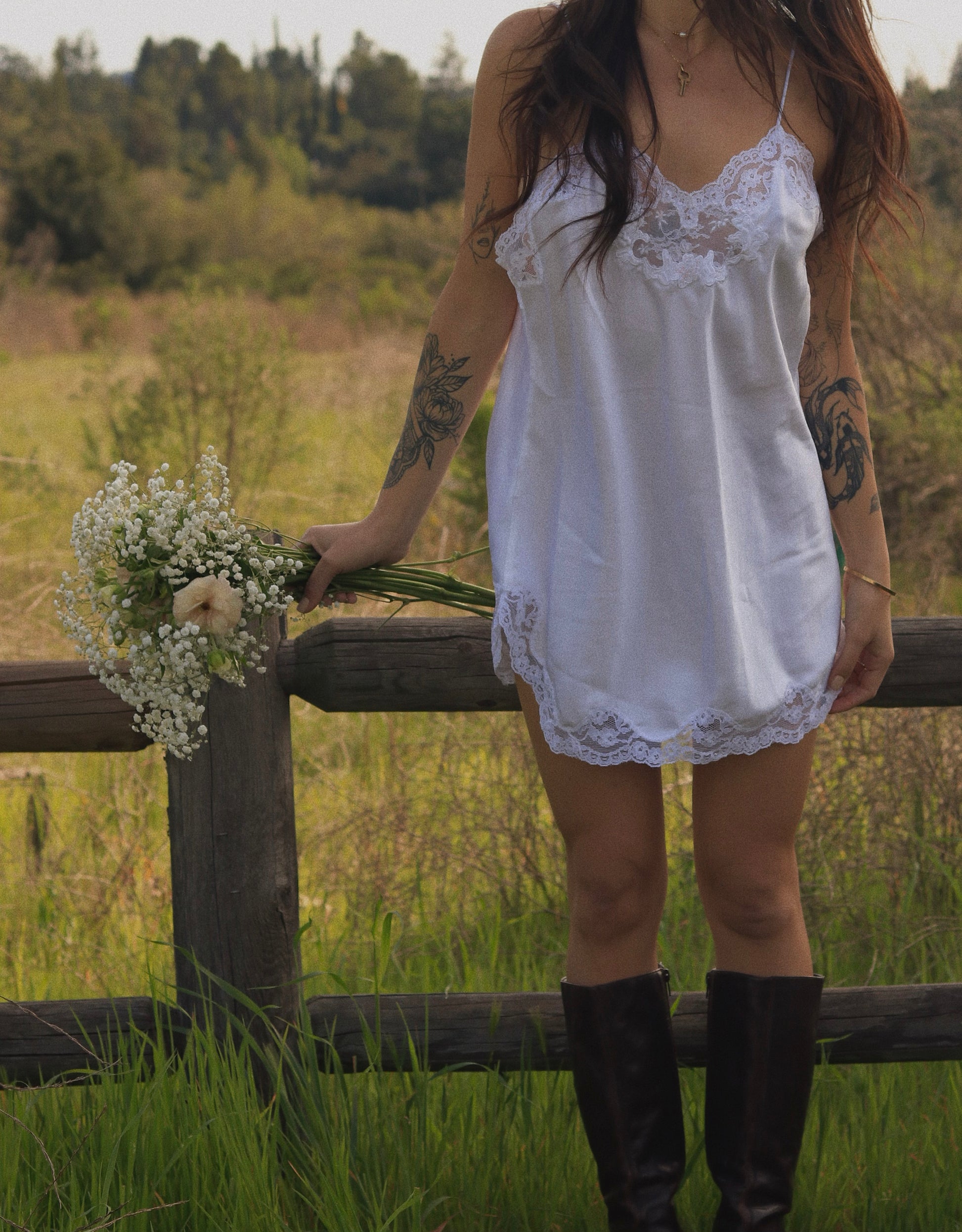 This vintage white slip dress has subtle light pink stitch detailing in a floral pattern at the chest, along with lace trimming. This slip is adorable, dainty, and even more perfect for a bride! This slip is size S/M!