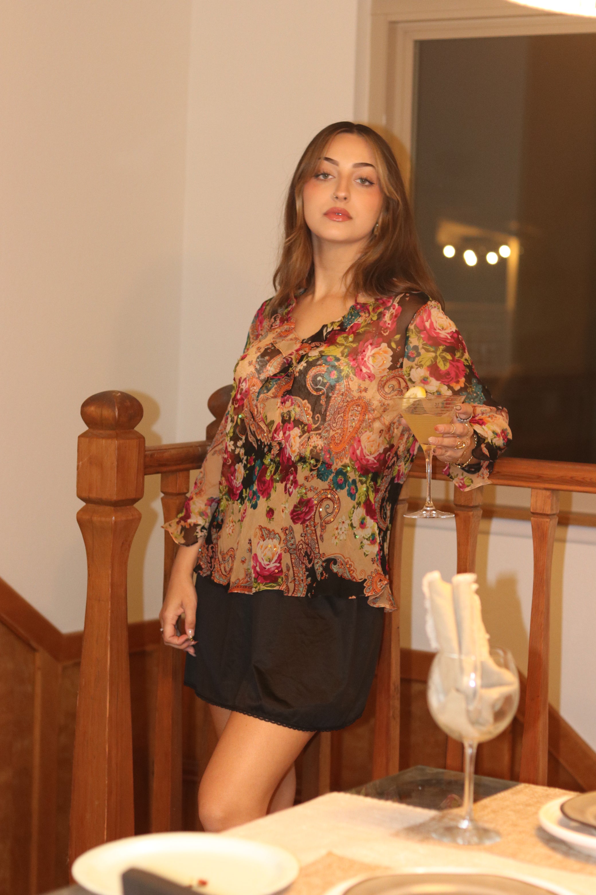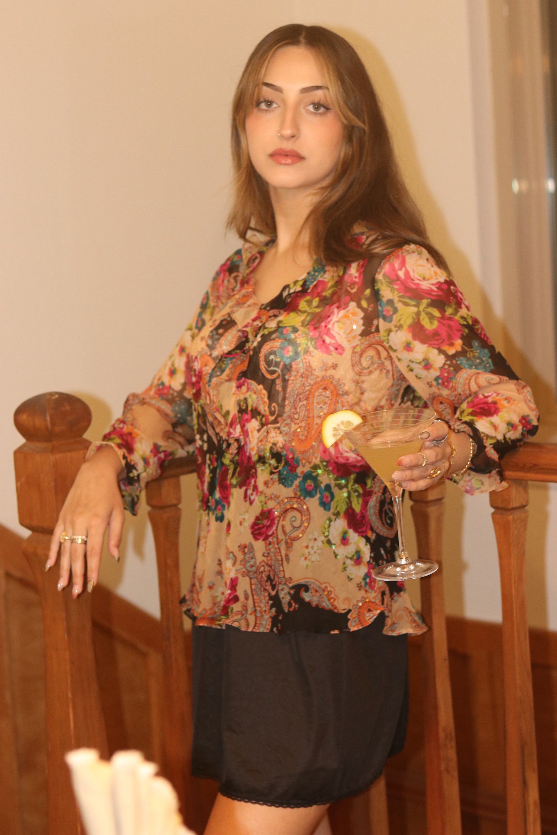 This vintage sheer blouse is covered in such a stunning floral and paisley pattern with subtle hints of beading and sequins, giving it a lovely shine. This top is a size medium, and is on a size small model.