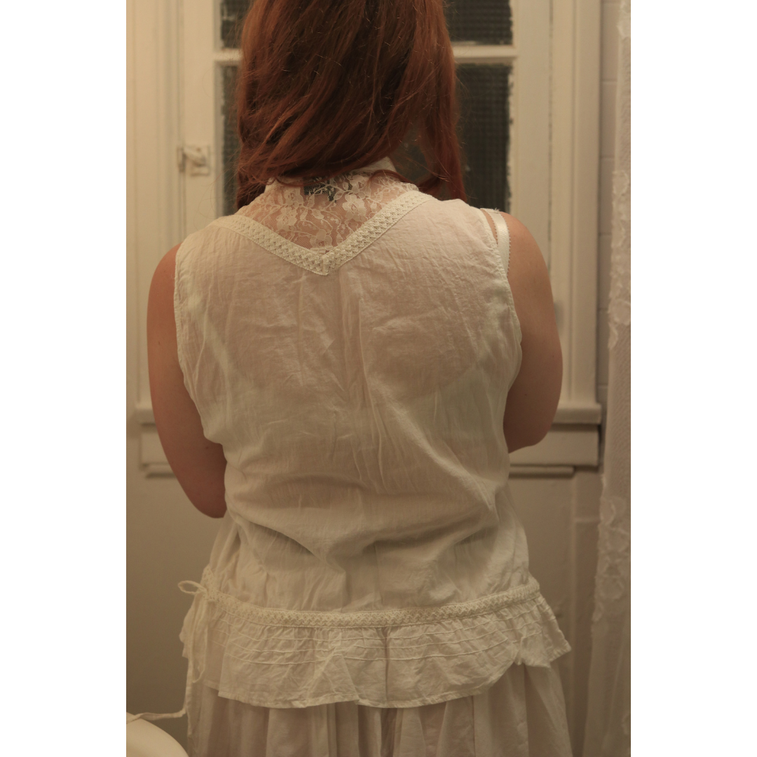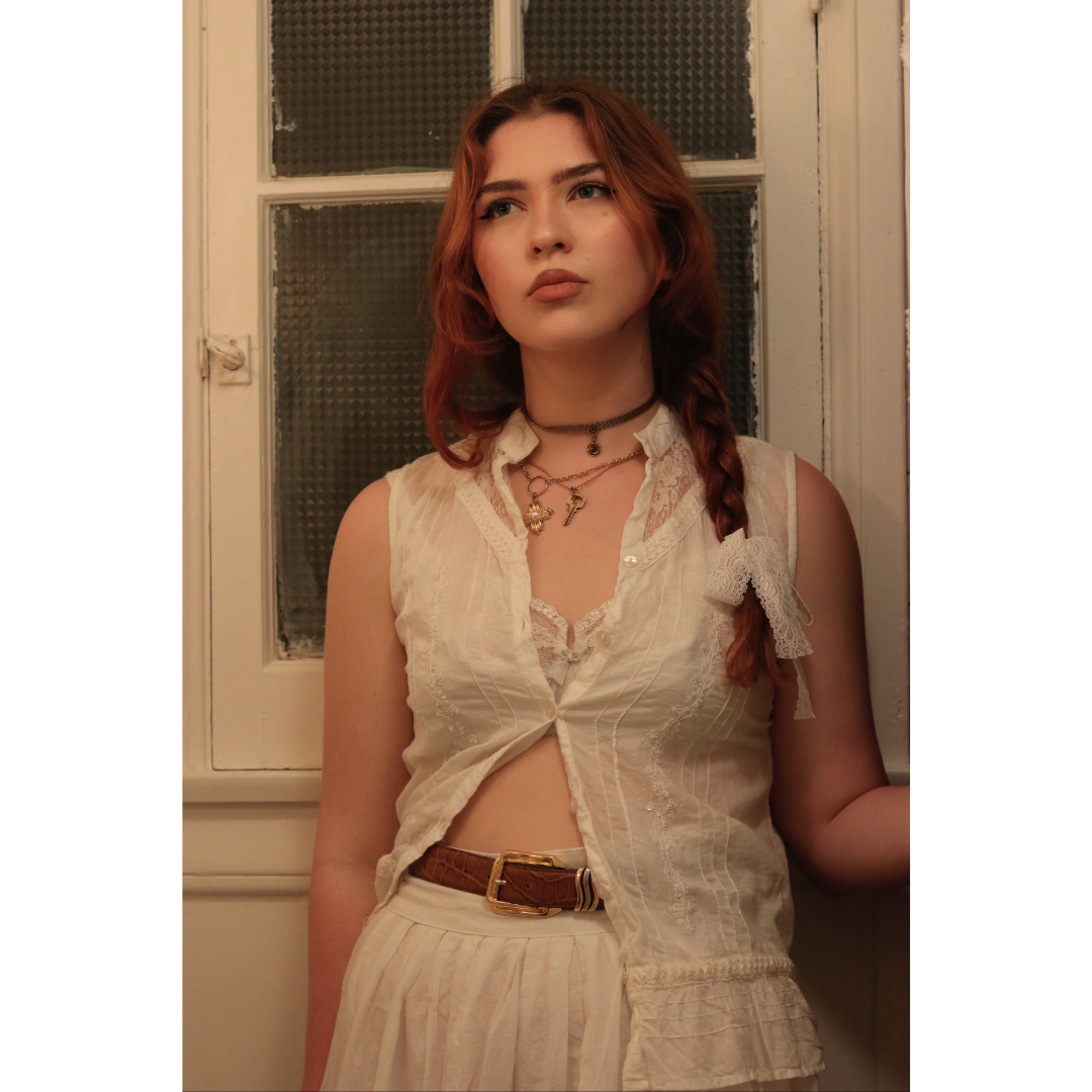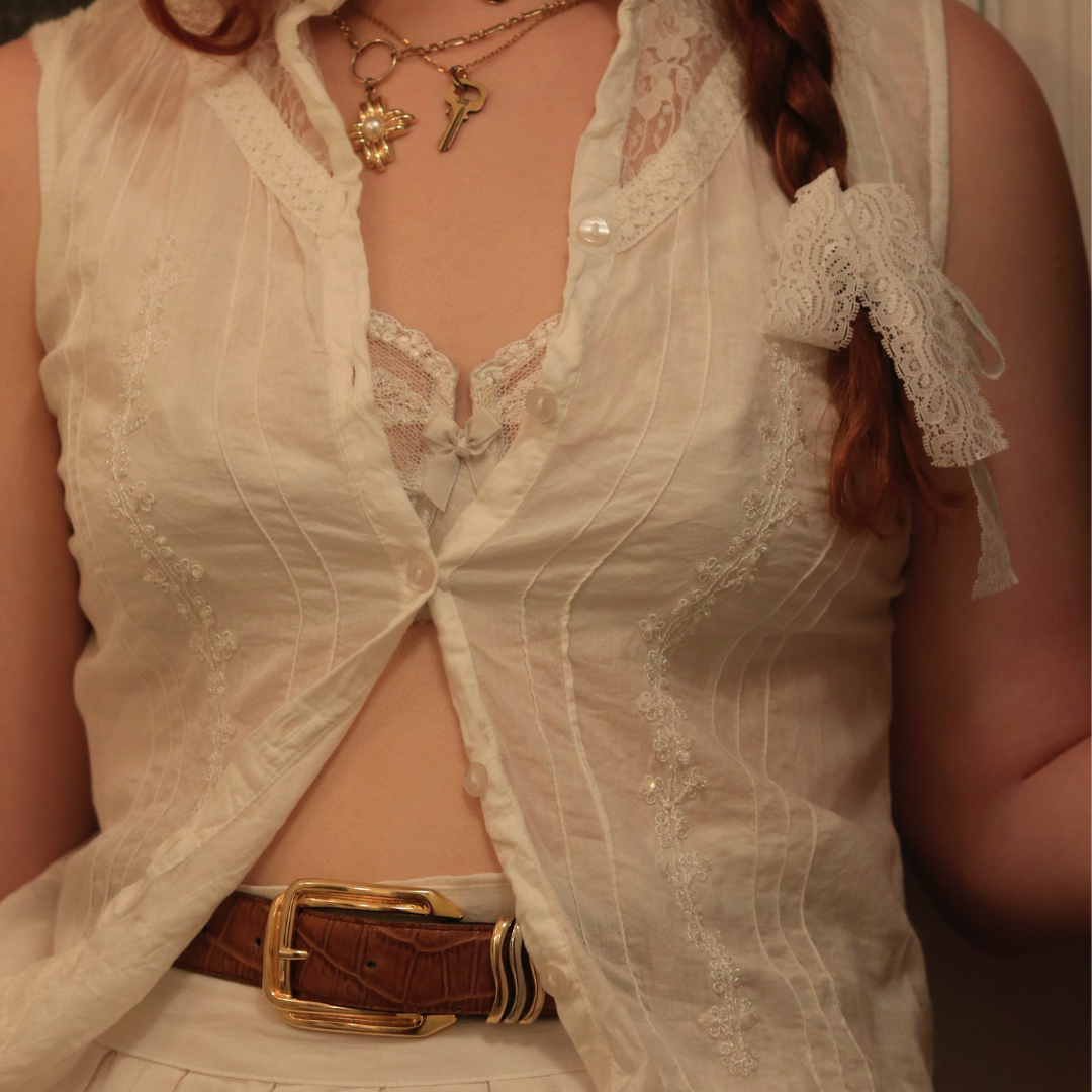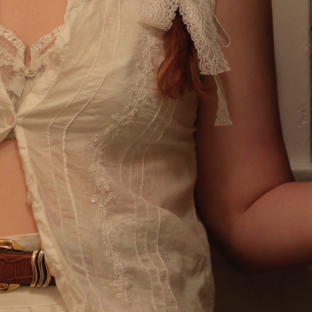 This vest is a lightweight top, that can be worn as a vest, or top. This vest/top gives a feminine touch to just about any outfit. There is gorgeous bead work along the front, and ties on the side to adjust the the fit along the bottom. This top is a size small, but can fit a medium as well.