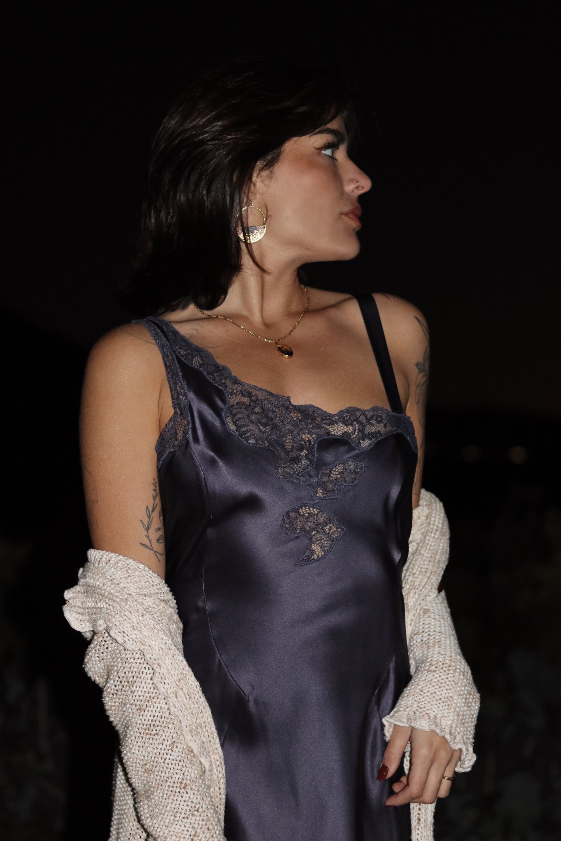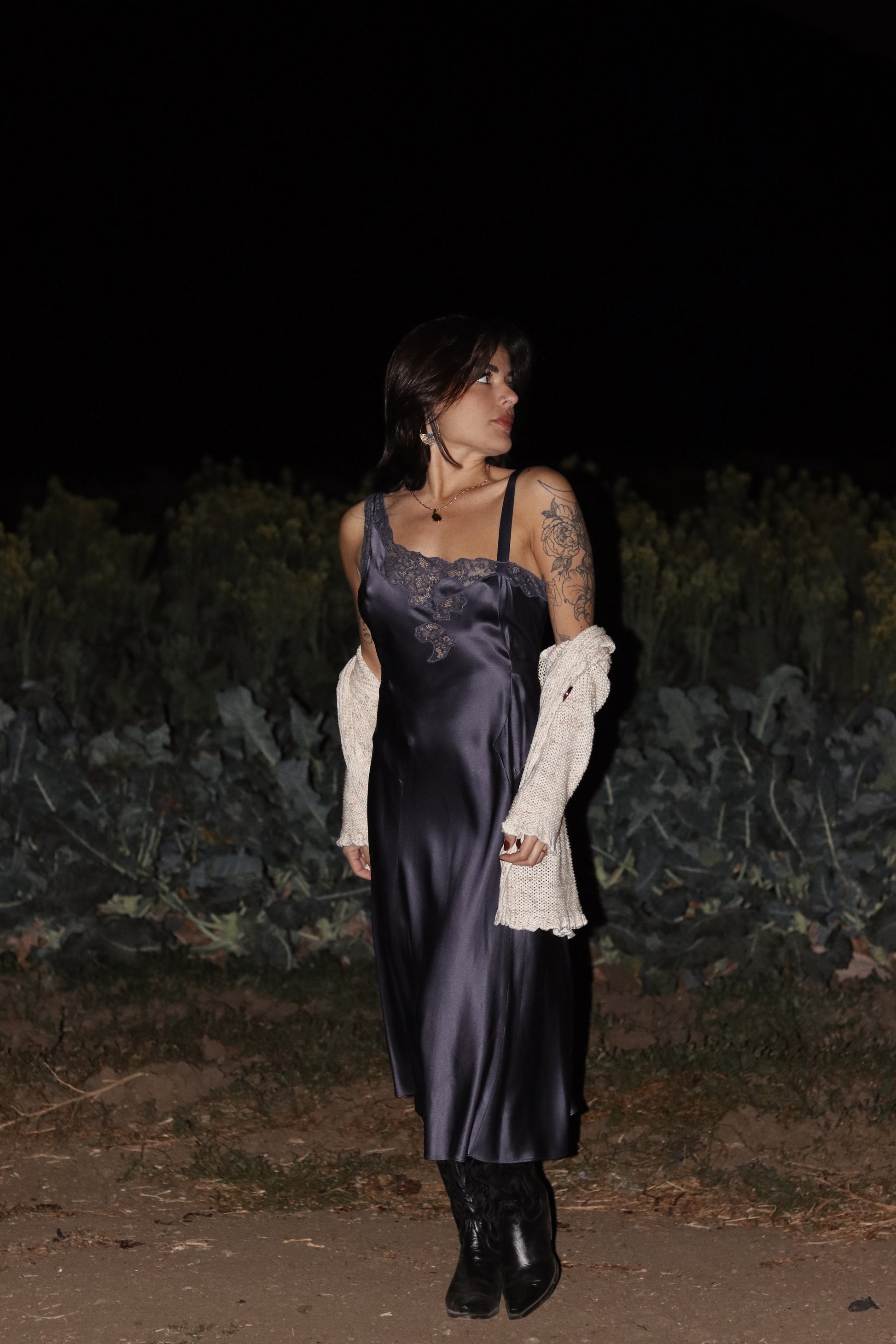 Discover the timeless elegance of The Midnight Dress, a stunning early 2000s slip dress designed with delicate lace accents, a flattering waist tie, and contrasting shoulder straps. The rich midnight blue color exudes sophistication, making it perfect for any season, but especially breathtaking for winter evenings. Whether you’re dressing up for a night out, attending a wedding as a wedding guest, or seeking an elegant cocktail dress, this piece is versatile and chic.