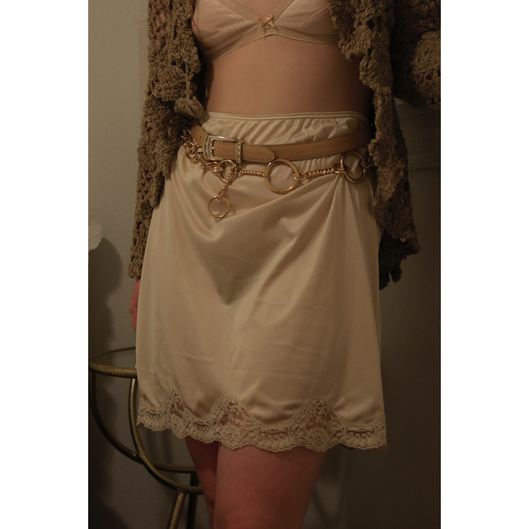 This vintage slip skirt is a stunning, cream color. This slip pairs well with oversized vintage tees, crop tops, and so much more. This skirt can be a cute piece to add bulkier pieces on top as we head into fall. Fits like a large