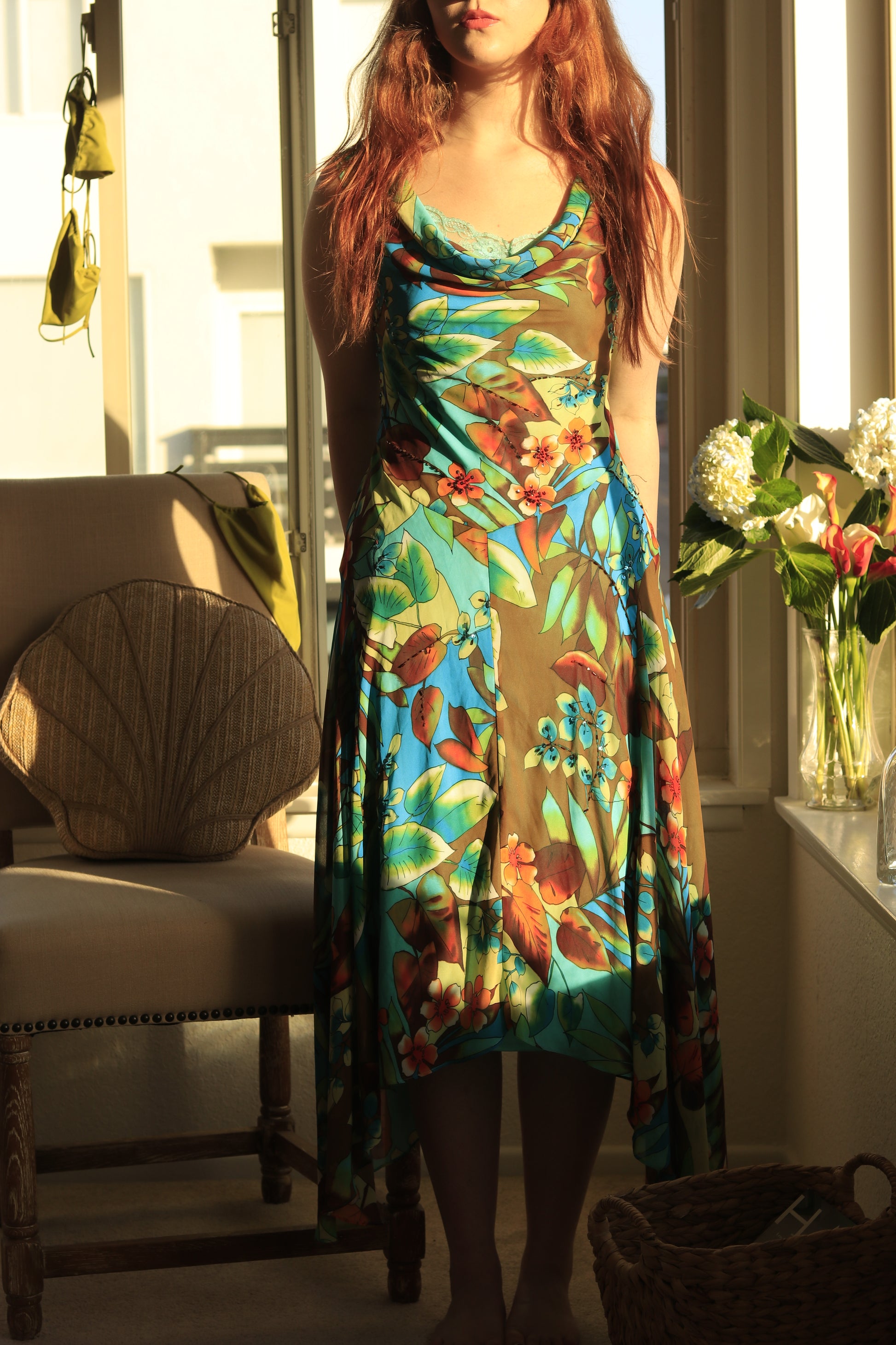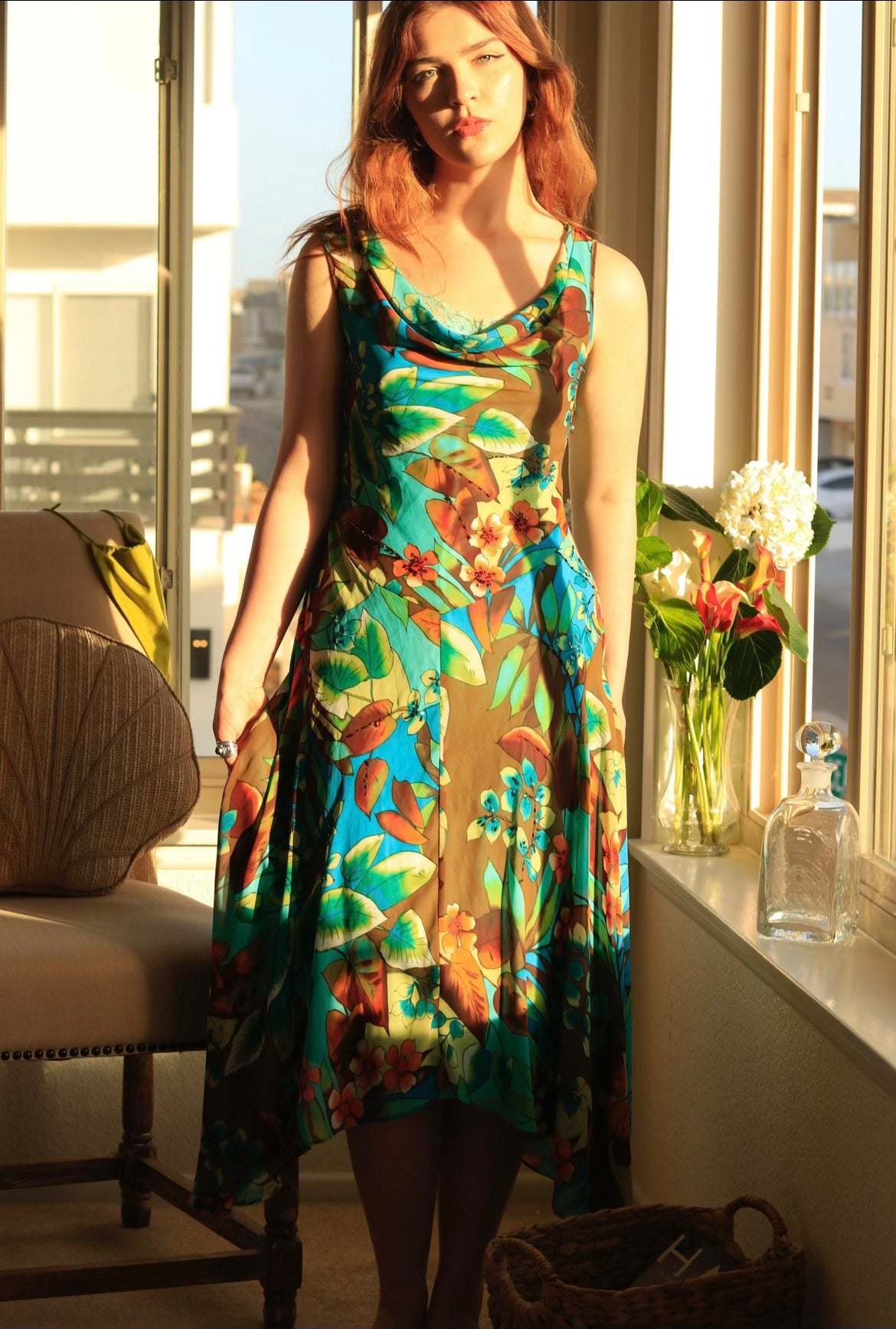This Y2k cocktail dress is both fun and flirty! It has stunning patterns and colors along with some pretty sequins and beading on the floral designs. This dress says it’s a 12 but it fits like a medium. The model wearing the dress is a medium on top and large on bottom. This is early 2000’s sizing so things are smaller than they say.