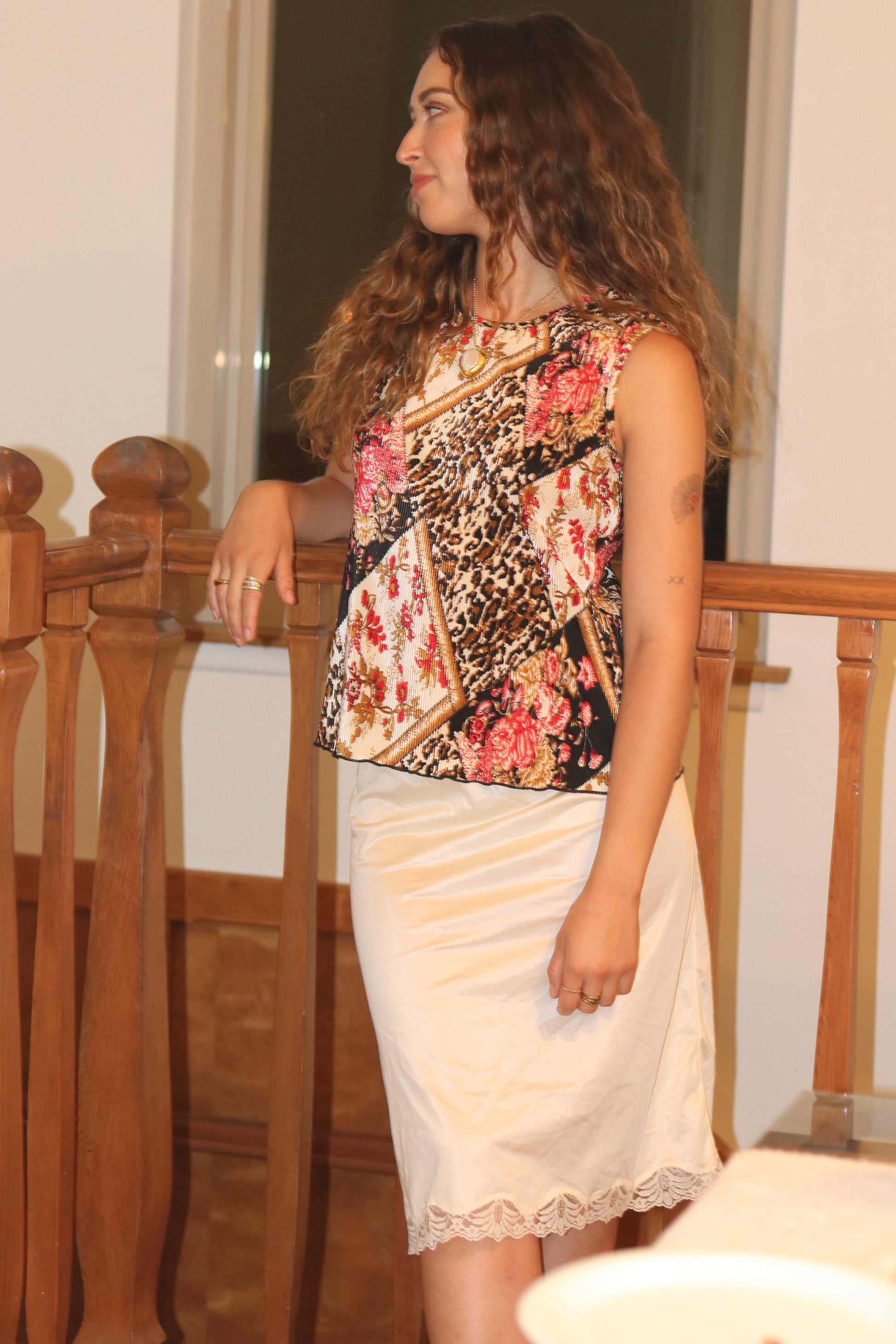 This tank top has a fun series of different patterns mixed together. This top has a stretchy and crepe like fabric. This tank top is a size medium, but the model is a size small.
