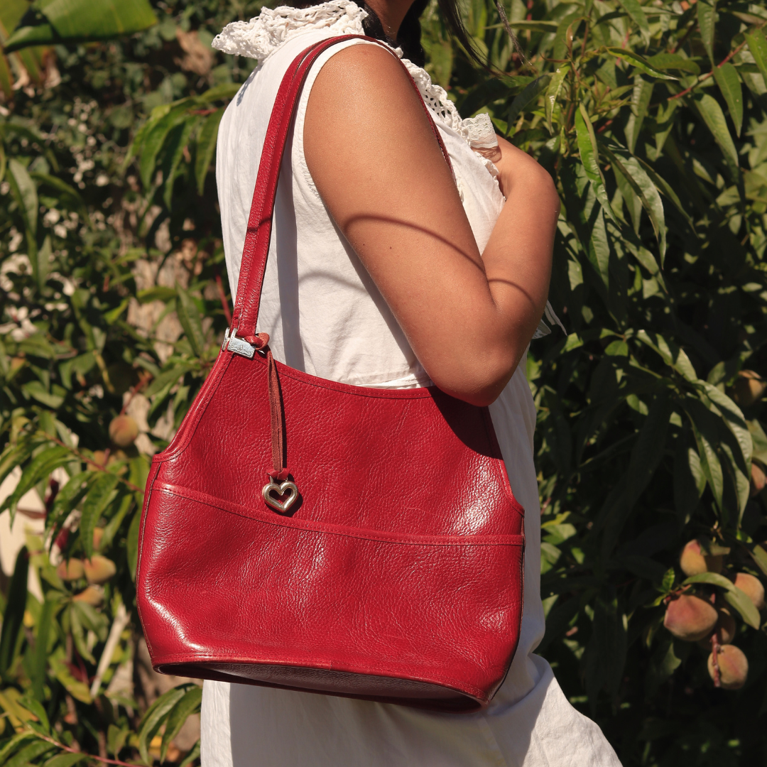 A vintage leather bag, in the color red. Embellished with silver hardware and beautiful, dainty, feminine details.